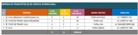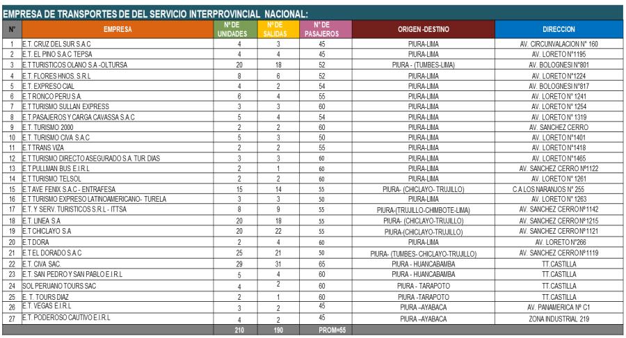 empresas de buses para el servicio de ámbito nacional, brindando el servicio de manera diaria, cubriendo las siguientes rutas