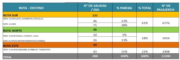 Los principales destinos del servicio nacional se encuentran en el sur. donde, sus destinos, son ChiclayoChimbote-Trujillo, y Lima predominan los siguientes. En la ruta internacional, la mayoría de las salidas importantes se encuentran en Guayaquil.