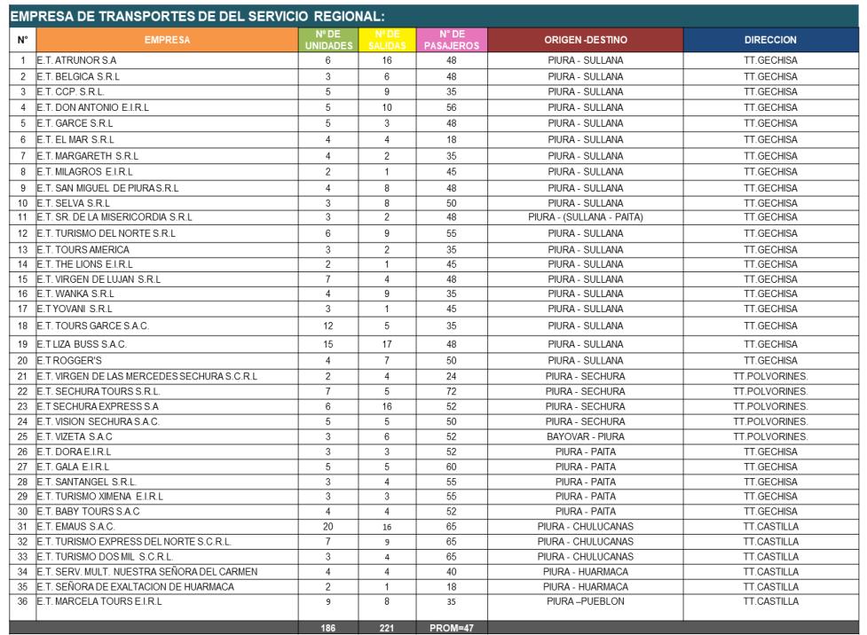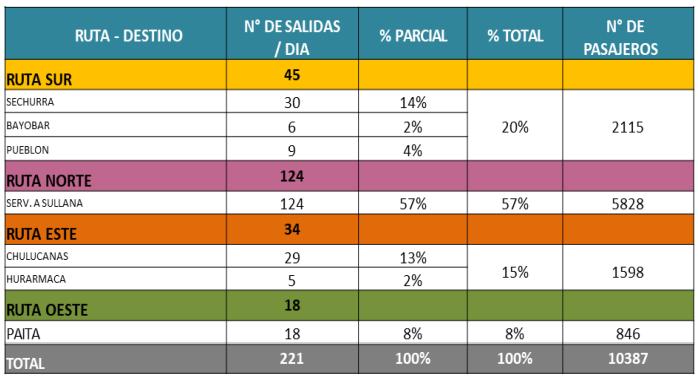 Son diversos los destinos de servicio Regional donde las salidas son hacia el norte, sur, este y oeste. Teniendo una mayor demanda las salidas en servicio hacia el Norte con destino a Sullana. Y, en segundo lugar, la ruta sur con destino hacia Sechura.