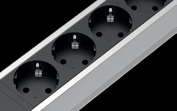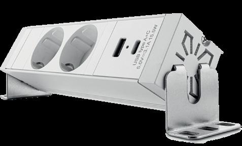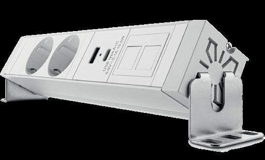 Unità di alimentazione integrata in piani di lavoro e altre superfici. Design elegante con struttura in alluminio. Con 2 prese da 230V, porte USB e keystone intercambiabili, questa unità offre un’alimentazione multifunzionale.