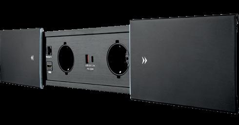 Unità di alimentazione con eleganti coperture in alluminio che scorrono per l’apertura. Integrabile in piani di lavoro, pareti e altre superfici. Con 2 prese da 230V, porte USB e keystone intercambiabili, questa unità offre un’alimentazione multifunzionale.