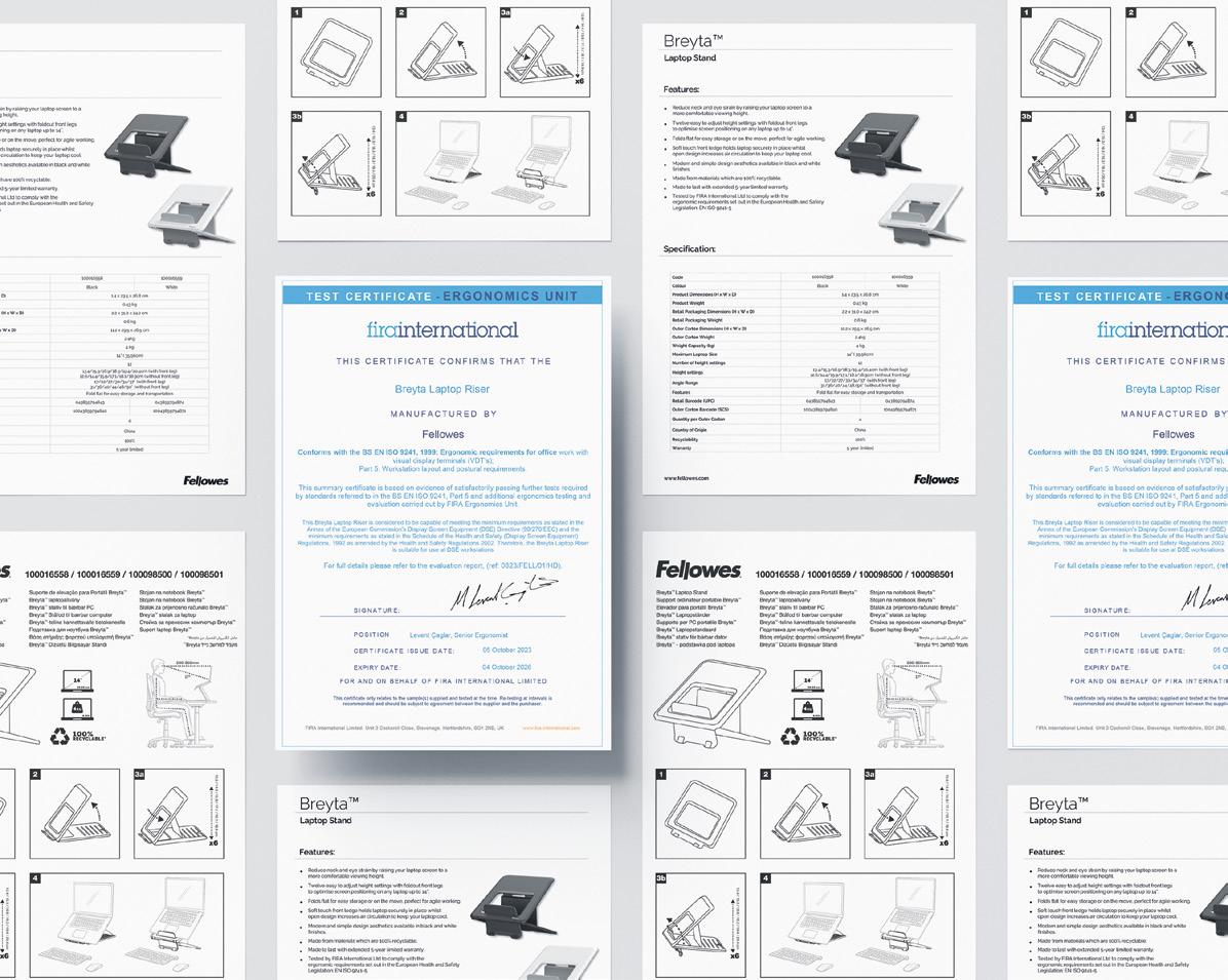 All Fellowes ergonomic solutions have been independently tested to comply with the ergonomic requirements set out in European Health and Safety Legislation: ISO 9241-5.