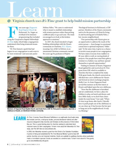 Theological Seminary in Richmond, a CBF partner. Members of the Hyaets community seek to be the presence of Christ by living in and becoming part of Enderly Park, a low-income neighborhood. “Our partnership with Hyaets gives us an opportunity to address the needs of the entire person — from hunger to emotional connection to spiritual emptiness,” Fallen said. “At the same time, it gives us a chance to involve many people in our congregation. We have taken everyone from toddlers to 80-year-olds to work on varying kinds of projects. Our people have used their gifts to minister in a holistic way and have opened themselves to growth opportunities.” Finding its mission at Hyaets, Huguenot Road applied for and received an It’s Time grant from CBF, which is available to churches that have completed the study. With grant funds, the church converted an old shed into a new clubhouse for Hyaets and formed an intern exchange program. Molly Carr, 16, from Huguenot Road served this summer as the first intern at Hyaets and helped open the new clubhouse. “Now that the clubhouse is furnished and air conditioned, we have a place for children to play, eat lunch and dinner, and have Bible study, so we don’t have chaos inside the main house,” Carr said. “When it’s time to go home after lunch, I literally have to push people out of the clubhouse so we can clean up. It has become the hot spot to hang out in the neighborhood. It truly is a blessing.”