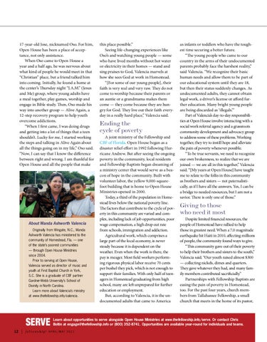 Ending the cycle of poverty A joint ministry of the Fellowship and CBF of Florida, Open House began as a disaster relief effort in 1992 following Hurricane Andrew. But after seeing the ongoing poverty in the community, local residents and Fellowship Baptists began dreaming of a ministry center that would serve as a beacon of hope in the community. Built with volunteer labor, the yellow 9,000-squarefoot building that is home to Open House Ministries opened in 2000. Today, a third of the population in Homestead lives below the national poverty line. The factors that contribute to the cycle of poverty in this community are varied and complex, including lack of job opportunities, poor wage compensation, a high drop out rate from schools, immigration and addiction. Agricultural work, which comprises a large part of the local economy, is never steady because it is dependent on the weather. Even when the work is there, the pay is meager. Most field workers performing rigorous physical labor receive 70 cents per bushel they pick, which is not enough to support their families. With only half of teenagers in Homestead graduating from high school, many are left unprepared for further education or employment. But, according to Valencia, it is the undocumented adults that came to America