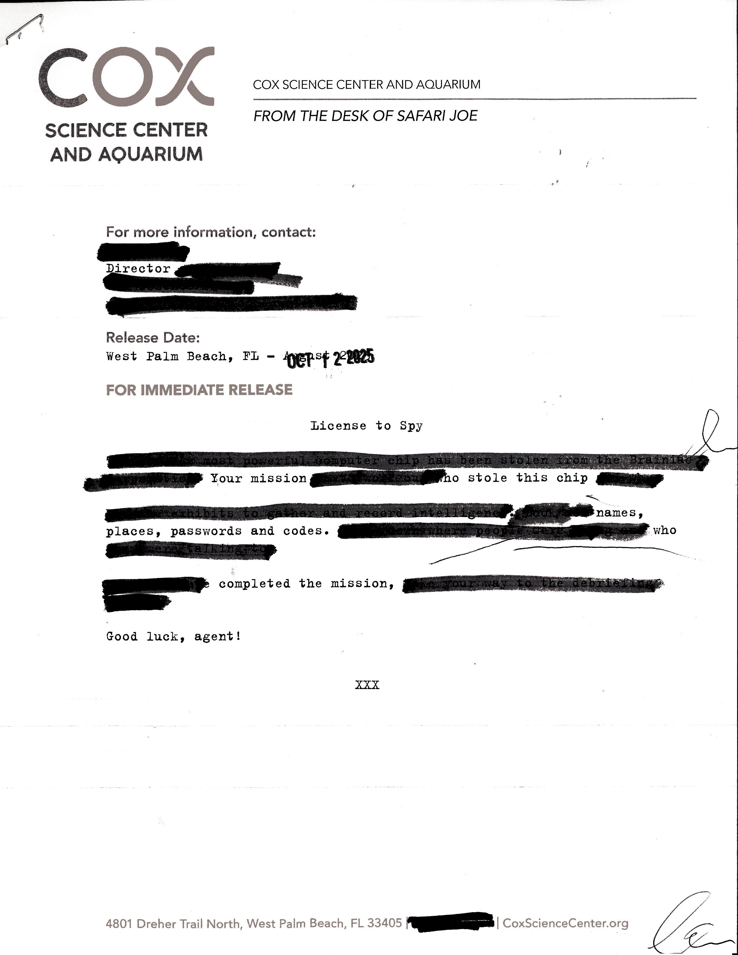 passes to visit, an annual membership, or stop in our Science Center store to purchase a wide variety of science goodies. Bring the gift of exploration home with interactive science kits or a plethora of small treasures. Members save 10% on purchases. Store items may be ordered by telephone at 561-832-1988. Memberships may be purchased on their website www.CoxScienceCenter.org.