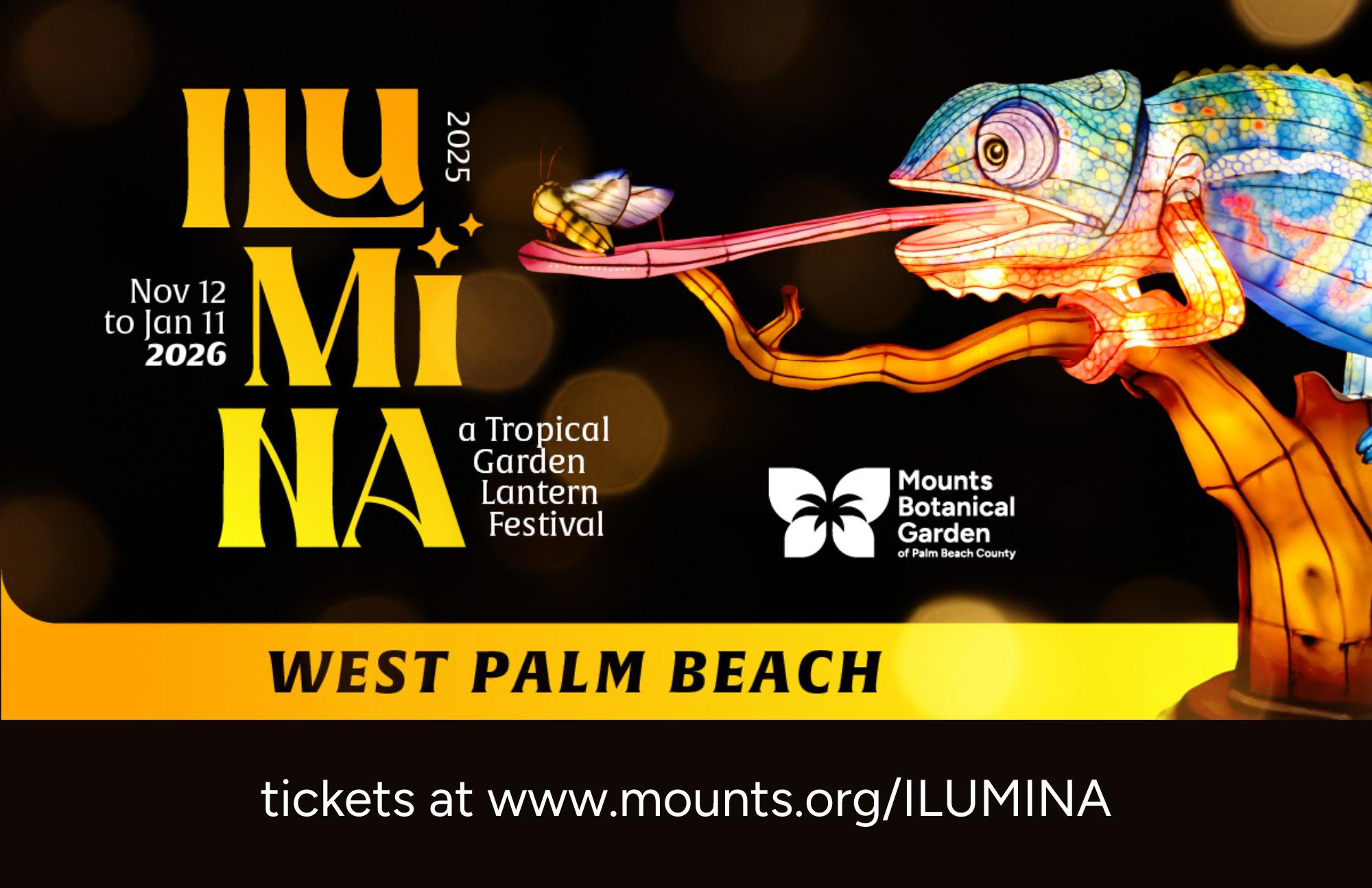 A Tropical Garden Lantern Festival, a breathtaking nighttime event that transforms the Garden into a vibrant world of light, color, and imagination. Inspired by centuries-old lantern artistry, the exhibition features more than 500 handcrafted silk lanterns—flamingos, chameleons, butterflies, orchids, and other tropical creations—that illuminate the pathways and blend art, tradition, and South Florida’s natural beauty into a magical holiday-season experience. This family-friendly, walkable event also offers festive food, cultural performances, and artisan crafts along the glowing trails, making it an ideal evening outing for families, couples, and friends. Tickets start at $16 for adults and $2 for children, with special pricing available for Garden Members. For details and ticket purchases, visit mounts.org/ilumina. Mounts Botanical Garden is Palm Beach County’s oldest and largest public garden, dedicated to inspiring and educating visitors about plants, sustainability, and the vital connection between people and nature.