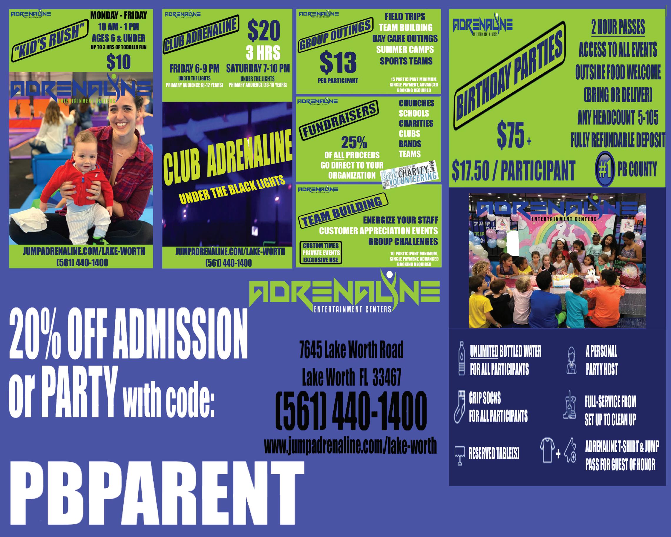Special. Children Ages 6 & Under can jump for $15 (M-F 10AM -1PM) Parents $2. For more info www. jumpadrenaline.com/lake-worth