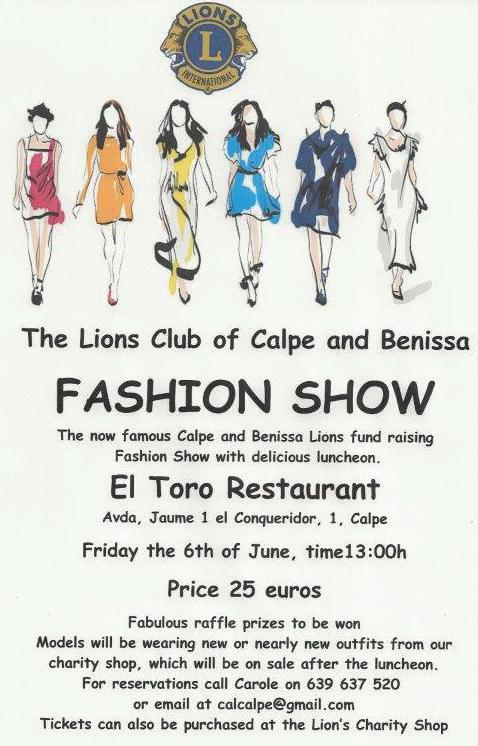 The Calpe Benissa Lions are pleased to announce that their now famous annual Fashion Show, will be held, as always, at the wonderful El Toro restaurant on Avenida Jaime 1, Calpe, on Friday the 6th of June, at 1pm. Tickets can be bought at the Calpe Benissa Lions Charity Shop, on Calle Pintor Sorolla 15, Calpe, priced at 25€.