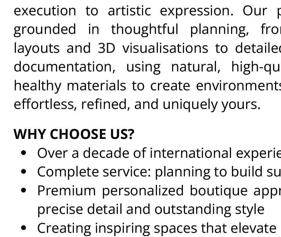 From concept to completion, we collaborate closely with you and the construction team - ensuring every detail flows seamlessly, from technical execution to artistic expression. Our process is grounded in thoughtful planning, from spatial layouts and 3D visualisations to detailed building documentation, using natural, highquality, and healthy materials to create environments that feel effortless, refined, and uniquely yours.
