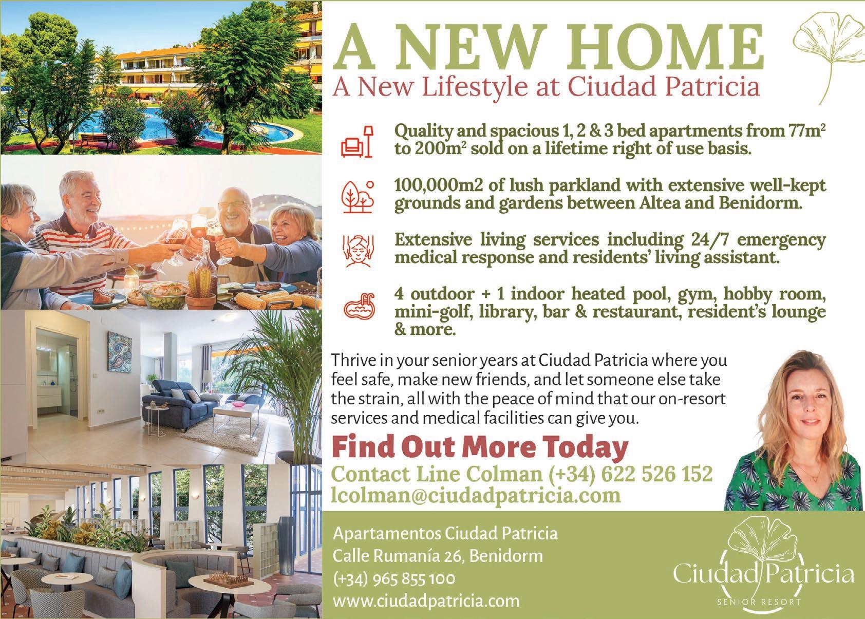 Ciudad Patricia Senior Resort is more than just a place to live; it is a place to thrive. It is ideal for seniors who already live in Spain and want to continue to experience the Spanish lifestyle in a retirement community that caters to their needs and wishes. If you are interested in learning more about this resort, please visit our website: www.ciudadpatricia.com or contact Line Colman on 622 526 152, or email: lcolman@ciudadpatricia.com to make an appointment to visit and find out more.