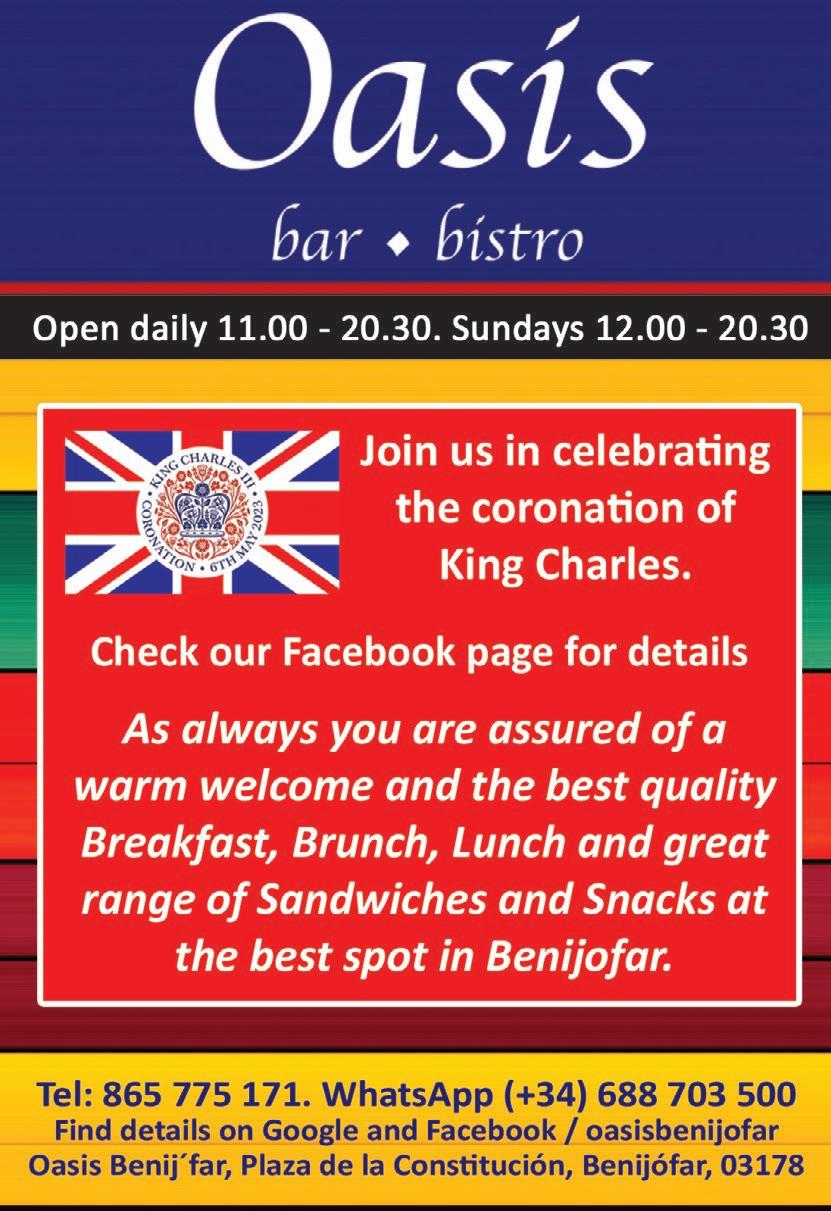 Afternoon Tea, Best Crown competition, a Victoria Sandwich competition for the men and a Coronation Quiz complete with a cava toast to Their Majesties. All are invited to this but please contact Sue Brassington (councillorlosbalcones@gmail.com) if you would like to come and join in the fun. All are welcome. The Coronation Celebration begins at 4pm and will take place outside La Siesta Church on Calle Granados, Torrevieja.