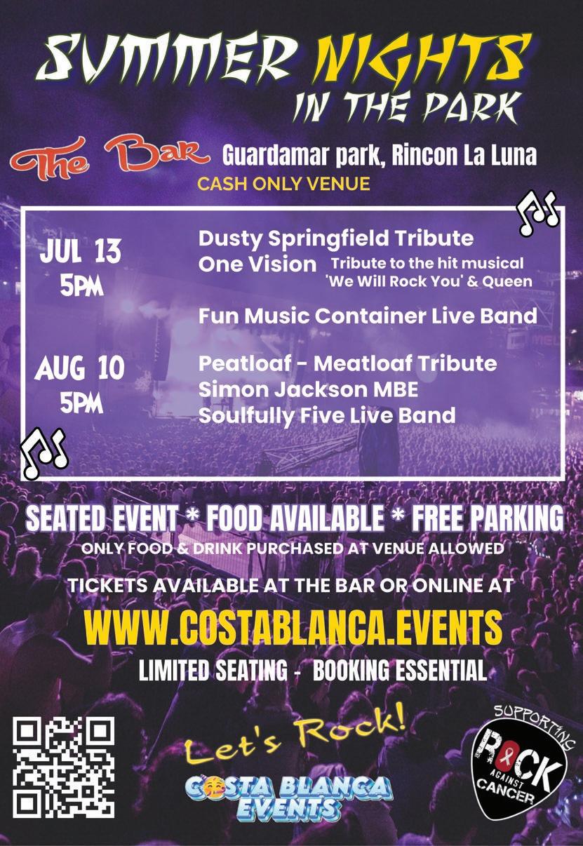 Coming up we have some incredible shows – at The Bar a monthly Summer Nights In The Park on a Saturday evening (see poster below), moving to a Sunday afternoon in September. Booking is essential to ensure seating which we have to pre book. Food is always available. Starting in September, we also begin a series of Wednesday afternoon shows ‘Afternoon Delights’ at Alannia Guardamar the first of which will debut Martin Toal – the ‘Wembley Tenor’ and ‘Kool & The Gang’.