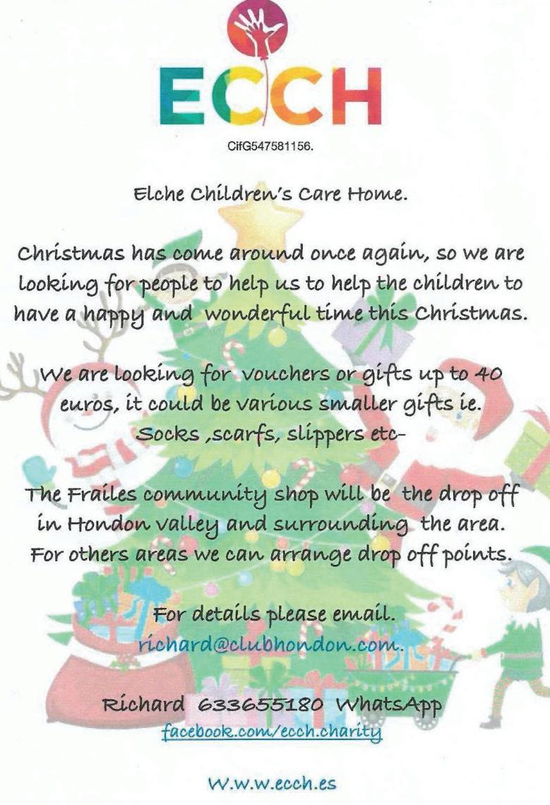 If you are able to help please contact Richard first via WhatsApp 633 655 180 and he will tell you all you need to know as well as give you the name of a child who you can buy a present or voucher for. Presents do not need to be wrapped. All vouchers must have “proof of purchase” till receipt in the envelope please.