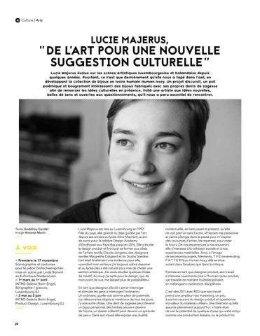" DE L’ART POUR UNE NOUVELLE SUGGESTION CULTURELLE " Lucie Majerus évolue sur les scènes artistiques luxembourgeoise et hollandaise depuis quelques années. Pourtant, ce n’est que dernièrement qu’elle nous a tapé dans l’oeil, en développant la collection de bijoux en ivoire humain Human Ivory. Un projet discursif, un poil polémique et bougrement intéressant : des bijoux fabriqués avec ses propres dents de sagesse afin de renverser les idées culturelles en présence. Voilà une artiste aux idées nouvelles, belles de sens et ouvertes aux questionnements, qu’il nous a paru essentiel de rencontrer.