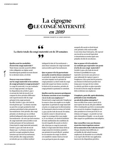 auxquels elle aurait eu droit durant cette période si elle avait travaillé. À son retour dans l’entreprise, elle reprend son travail ou un travail équivalent à rémunération au moins égale sans préjudice du fait de son absence. Que se passe-t-il si la salariée ne souhaite pas reprendre son poste à la fin de son congé maternité ? L’article L.332-4 du Code du travail lui laisse la possibilité de ne pas reprendre son travail, sans préavis et sans indemnité de rupture à payer à l’employeur. Cela a pour but de permettre aux femmes le désirant de prendre leur temps pour s’occuper de leur enfant. La salariée qui désire ne plus reprendre le travail à la fin du congé de maternité doit en informer son employeur. L’employée, peut-elle, après démission, prétendre à une réembauche au sein de la même entreprise ? Dans un délai d’une année à partir de la non-reprise du travail, elle peut solliciter d’être réembauchée par lettre recommandée avec accusé de réception. L’employeur est alors pendant un an tenu par la loi, le cas échéant, de l’engager - en priorité sur tout autre demandeur d’emploi - en cas de poste libre auquel ses qualifications sont adaptées. Que conseillez-vous aux femmes ayant des interrogations autour de la maternité et du Code du travail ? Chaque situation étant différente, il est loisible du côté salarié (comme employeur), de demander un avis détaillé à un expert afin d’éviter une application incorrecte des dispositions précitées.