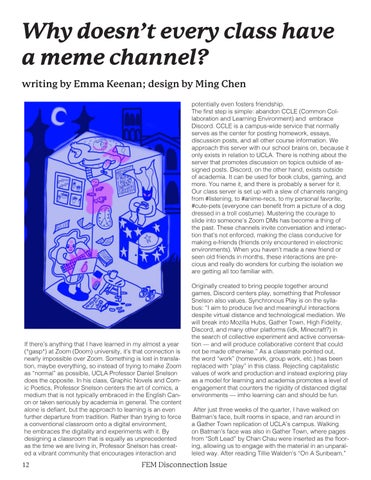 If there’s anything that I have learned in my almost a year (*gasp*) at Zoom (Doom) university, it’s that connection is nearly impossible over Zoom. Something is lost in transla tion, maybe everything, so instead of trying to make Zoom as “normal” as possible, UCLA Professor Daniel Snelson does the opposite. In his class, Graphic Novels and Com ic Poetics, Professor Snelson centers the art of comics, a medium that is not typically embraced in the English Can on or taken seriously by academia in general. The content alone is defiant, but the approach to learning is an even further departure from tradition. Rather than trying to force a conventional classroom onto a digital environment, he embraces the digitality and experiments with it. By designing a classroom that is equally as unprecedented as the time we are living in, Professor Snelson has creat ed a vibrant community that encourages interaction and potentially even fosters friendship. The first step is simple: abandon CCLE (Common Col laboration and Learning Environment) and embrace Discord. CCLE is a campus-wide service that normally serves as the center for posting homework, essays, discussion posts, and all other course information. We approach this server with our school brains on, because it only exists in relation to UCLA. There is nothing about the server that promotes discussion on topics outside of as signed posts. Discord, on the other hand, exists outside of academia. It can be used for book clubs, gaming, and more. You name it, and there is probably a server for it. Our class server is set up with a slew of channels ranging from #listening, to #anime-recs, to my personal favorite, #cute-pets (everyone can benefit from a picture of a dog dressed in a troll costume). Mustering the courage to slide into someone’s Zoom DMs has become a thing of the past. These channels invite conversation and interac tion that’s not enforced, making the class conducive for making e-friends (friends only encountered in electronic environments). When you haven’t made a new friend or seen old friends in months, these interactions are pre cious and really do wonders for curbing the isolation we are getting all too familiar with.