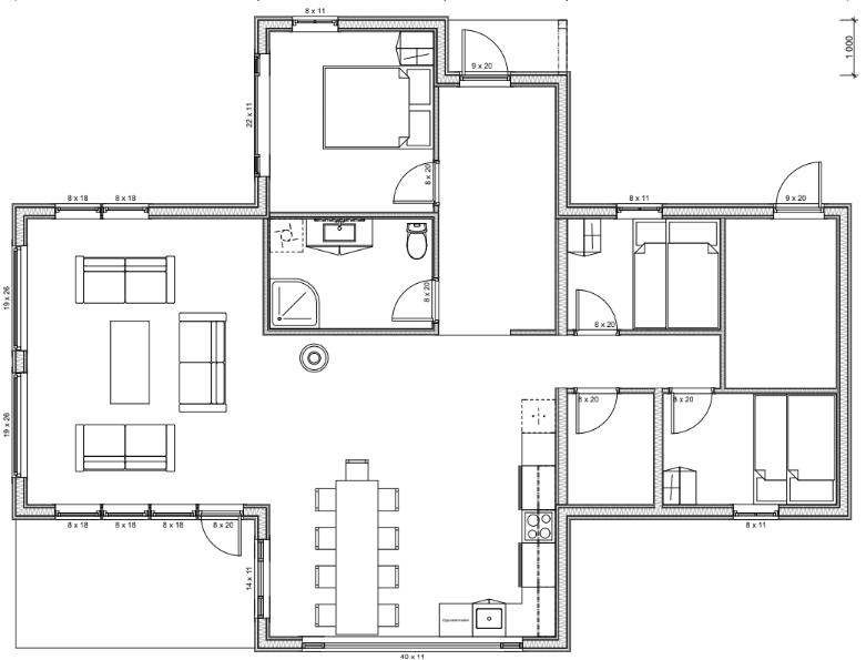 Stue, kjøkken, bad, 3 soverom med åtte faste sengeplasser, entre, innvendig og utvendig bod.