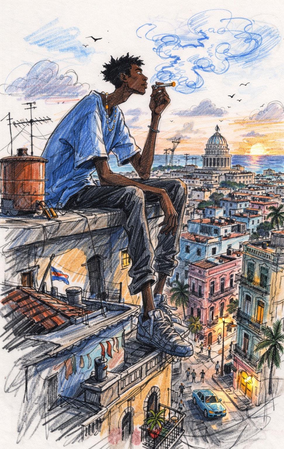 Allá fuma en el balcón desnudo como un azulejo mirando la azotea. Allá cierne la noche entre los dedos. Se lleva todo lo que le cabe en una mano luego lo vende.