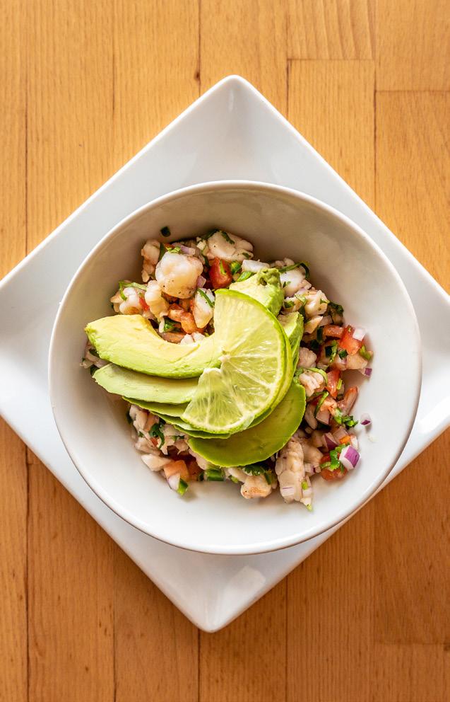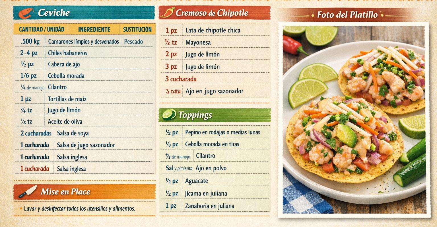 durante unos 15 a 20 minutos para que el camarón se curta. 6. Acompaña con totopos o tostadas o sobre chips que más le agrade, 1 rebanada de piña asada en mismo comal, la zanahoria y la jícama en julianas, a salsa cremosa y aguacate en cubos