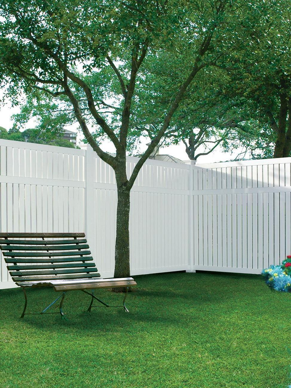 TruConnect Vinyl Privacy Fence features an interlocking picket system designed for enhanced strength and wind resistance, offering full privacy and durability.