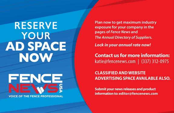 To determine what type of operator a company is, refer to the Main Index. Companies may operate in more than one capacity, i.e., they are both a Manufacturer (M) and a Wholesale-Supplier (WS). Ad page references are also found in the Main Index and Geographical Index of Suppliers. Information for the listings in this index was provided to Fence News USA by the listed companies, and was verified by the publication to the best of its abilities. However, keep in mind that product lines may change during the shelf life of this directory.