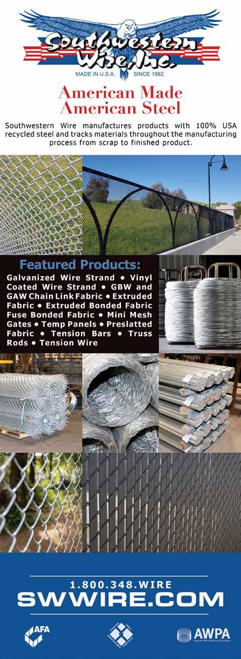 4 APRIL 2024 | FENCE NEWS USA THE FENCING SUPPLY EXPERTS FOR OVER View our catalog at www.abbeyhardware.com 1-866.98.ABBEY | sales@abbeyhardware.com | www.abbeyhardware.com HUGE SELECTION OF HARDWARE, FASTENERS AND TOOLS IN STOCK FOR THE FENCING INDUSTRY FENCING SUPPLY EXPERTS Ask about our hand tools promotion! DECORATIVE HARDWARE STANDARD HARDWARE WELDED WIRE LOCKS TOOLS SCREWS NAILS CONSTRUCTION SUPPLIES