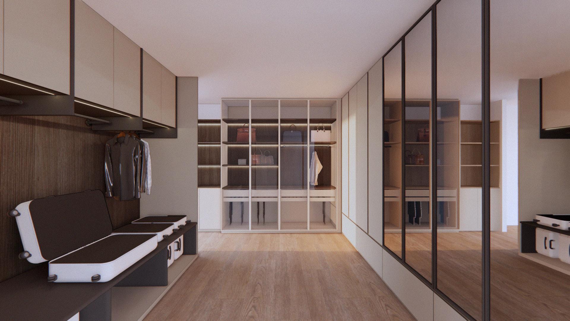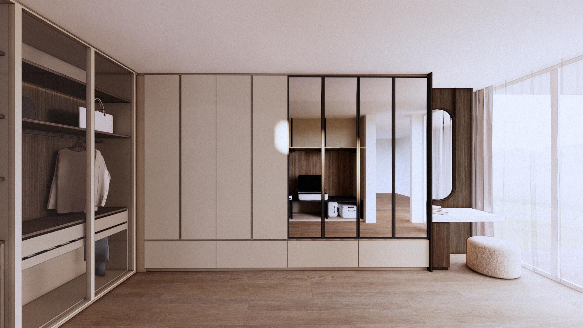 This design emphasizes the harmonious merging of three distinct materials within a single composition to create depth, contrast, and visual interest. Each material — whether matte, wood grain, or glass — is carefully selected not only for its texture but also for its tone, allowing each surface to complement and highlight the others.