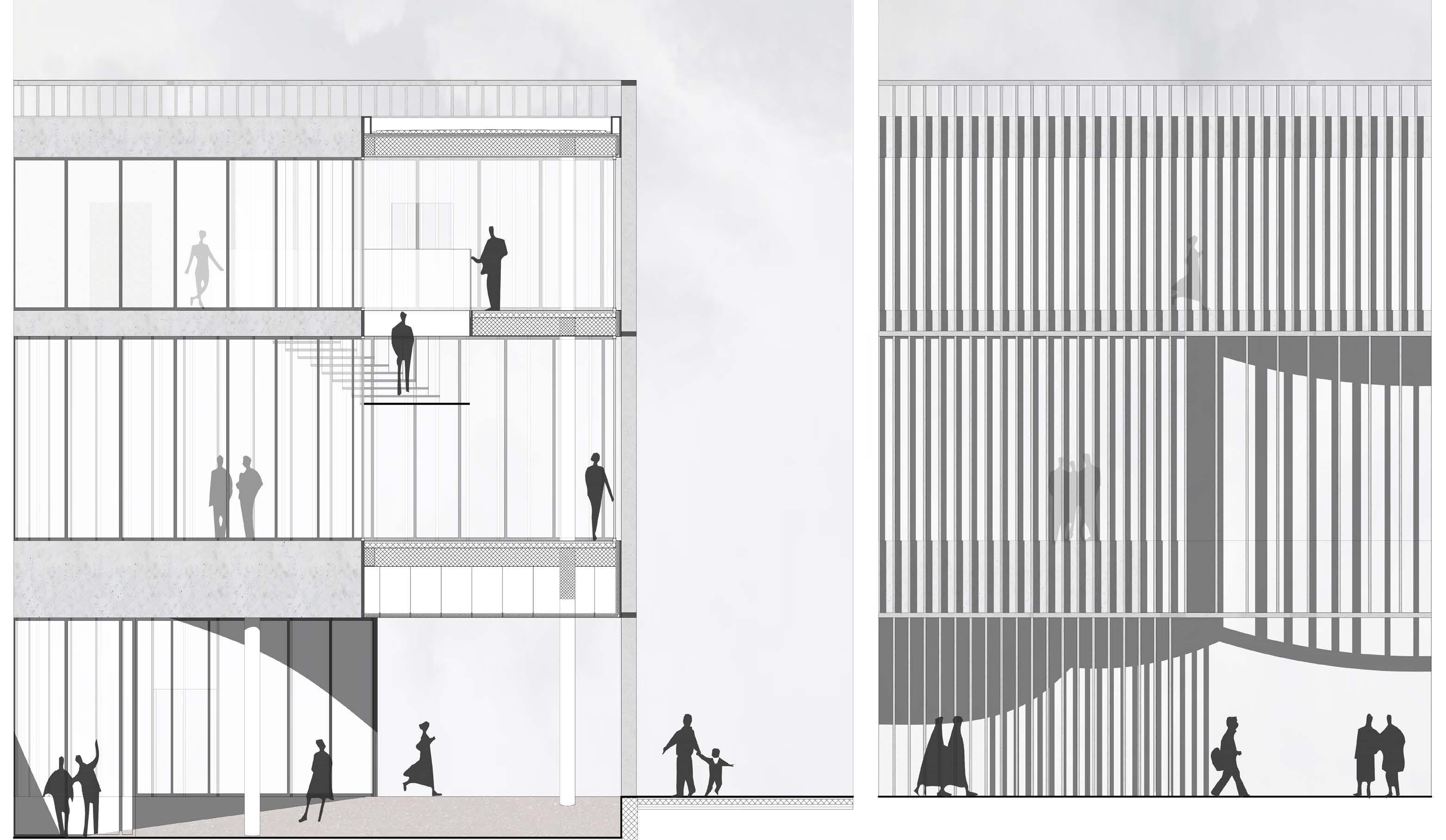 The new volume fills in the gap by maintaining a similar width and delimiting the opening of arches in line with the existing façades.