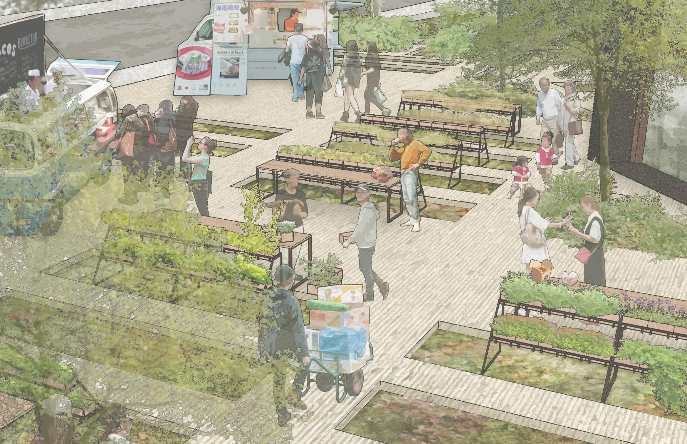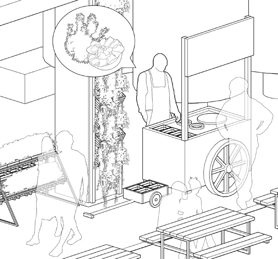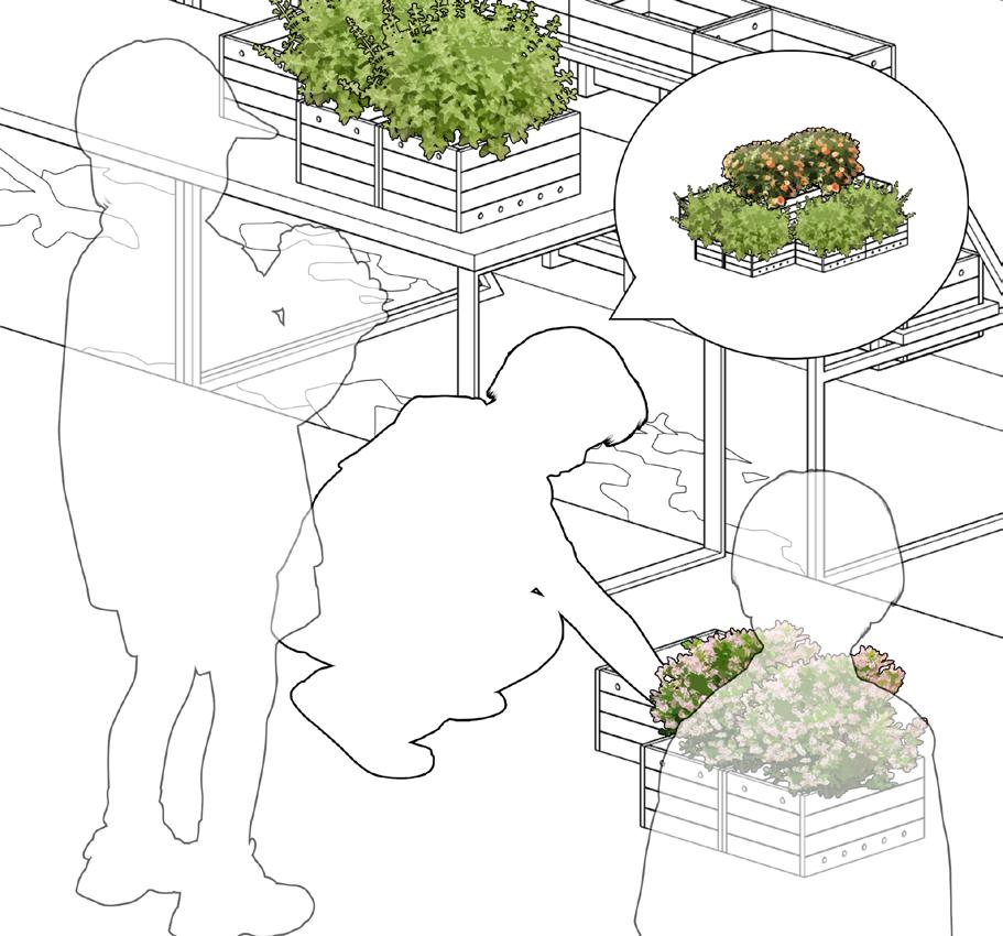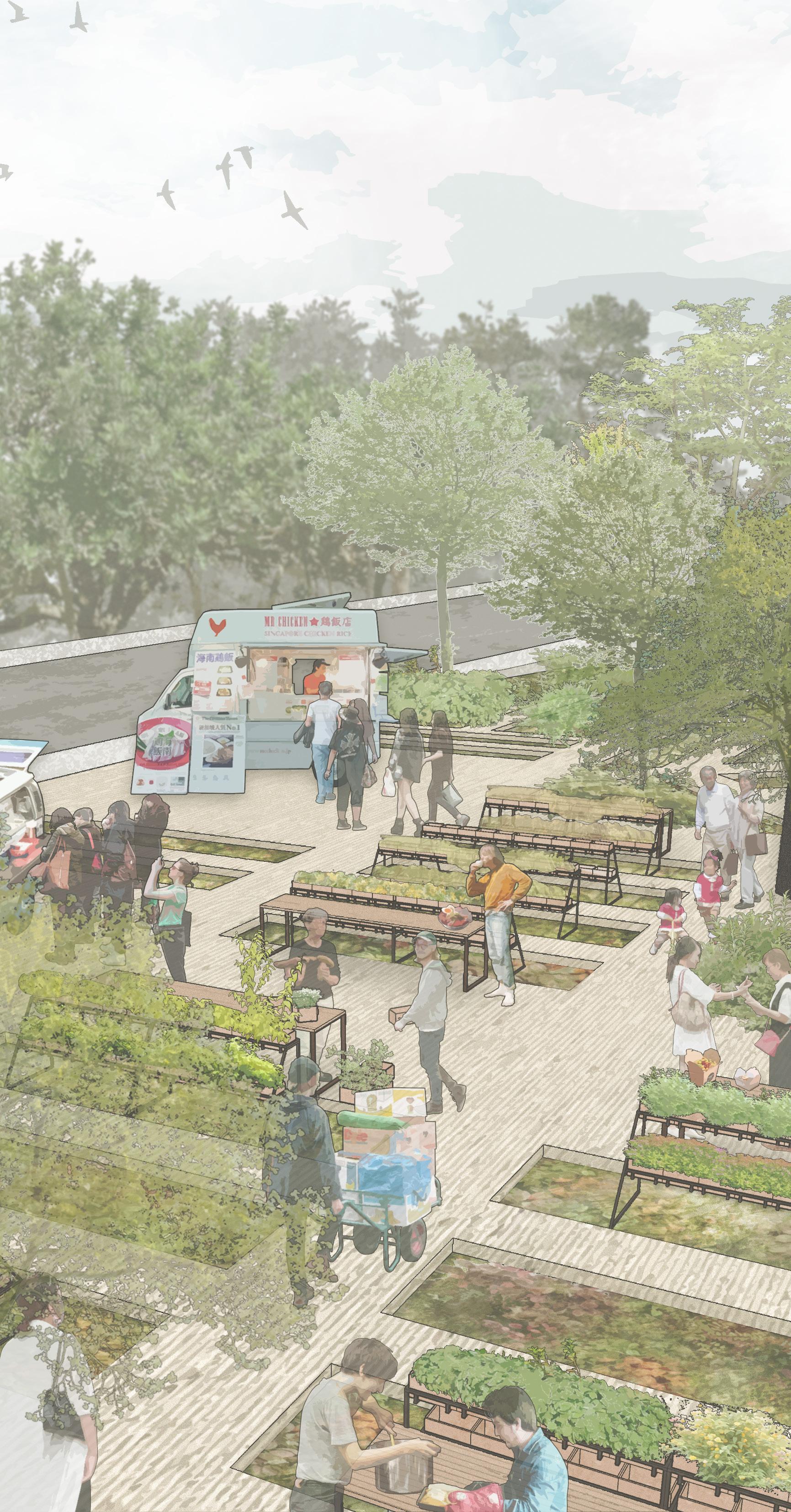 The two spaces are dedicated hospitality centre, small business incubator, and the nursery for all herbs cultivated on-site. By promoting small-scale, flexible activities and highly-customizable spaces, these two spaces are designed to encourage interaction of short-term for visitors, and long-term for any groups of interests.