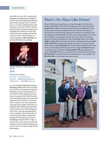 There’s No Place Like Home! Thomas Wolfe may have said that you can’t go home again, but eleven Fenn alumni would disagree. All of them are working in some capacity at the School: Jon Byrd ’76 has taught in the Lower School for thirty years; Nat Carr ’97, who teaches science and coaches football and lacrosse, will assume the position of head of the Lower School this fall, having served as director of secondary school counseling since 2009; Jim Carter ’54 can be found volunteering up in the archives room in Mulvany, scanning piles of photos from Fenn’s history and reaching out to former faculty and students for help in identifying alumni in the images; Geoffrey Cohane ’93 (not pictured) is the School’s consulting clinical psychologist; Frank Crowley ’06 (not pictured) joined the community a year ago as assistant athletic director; Alexei Doohovskoy ’91 teaches trombone and baritone horn and served as the Marching Band backup director this spring; Tory Hayes ’02 works as assistant director of admissions; Freemon Romero ’04 teaches Spanish and coaches; Ben Smith ’85 has been teaching in the Lower School for nineteen years; Jeff Trotsky ’06, is an assistant director of admissions and a science teacher; and Matt Ward ’00 is a social studies teacher and a coach.