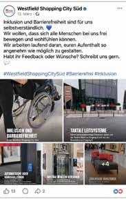 Die beiden Fahrrad-Stationen bei der Westfield Shopping City Süd vor Eingang 1 und Eingang 5 sind praktische Servicepunkte für Radfahrer. Diese Stationen bieten Fahrrad-Abstellplätze, wo man sein Rad bequem und sicher abstellen kann, während man shoppen geht. Vorort werden auch Luftpumpen und einige Basic-Service-Möglichkeiten geboten. Weiters gibt es auch kostenlose E-Bike-Ladestationen, die rund um die Uhr nutzbar sind.