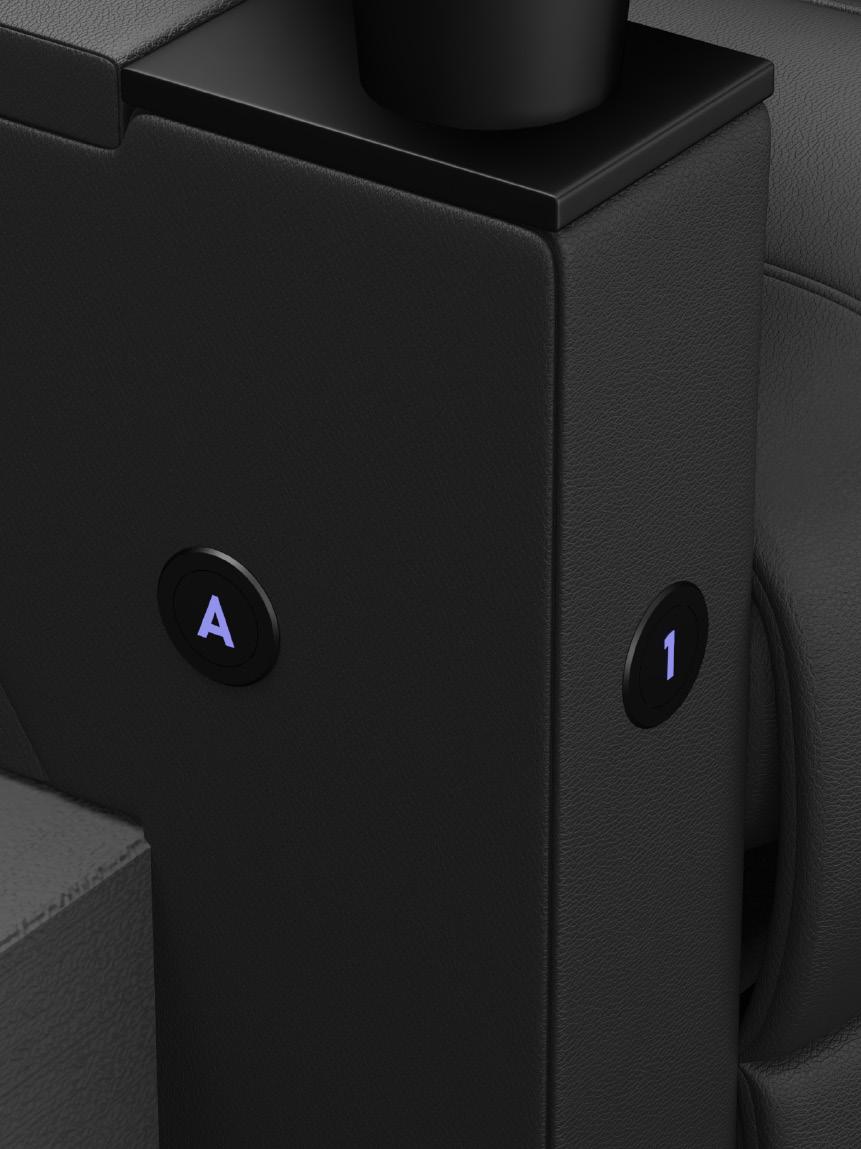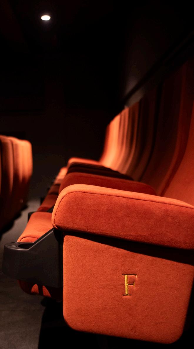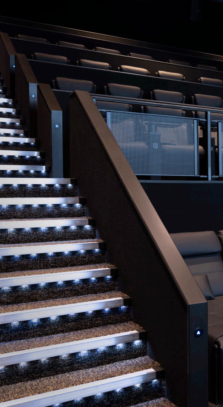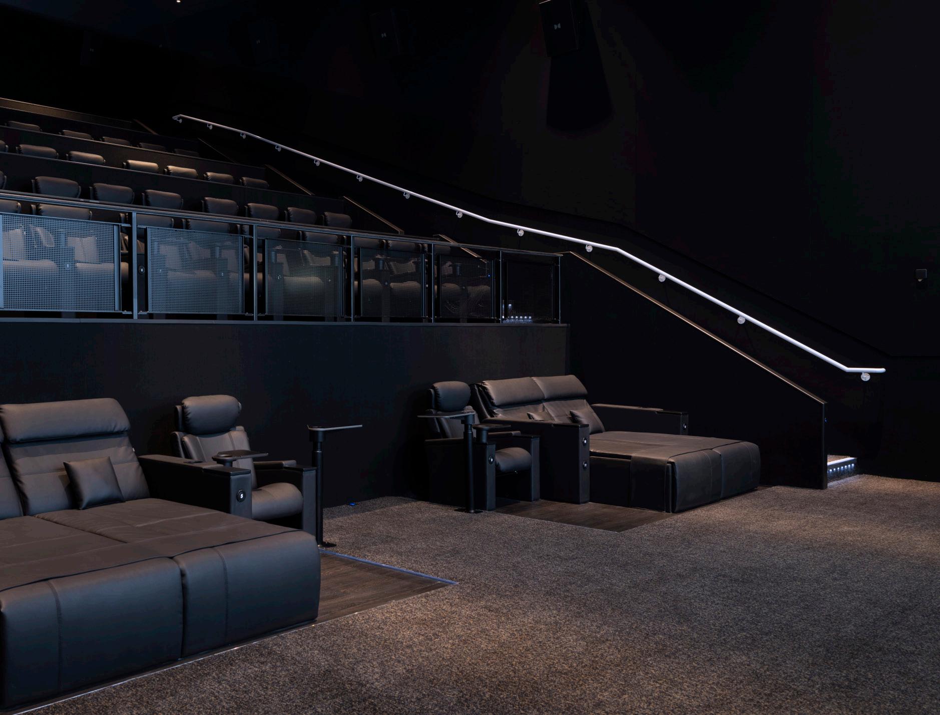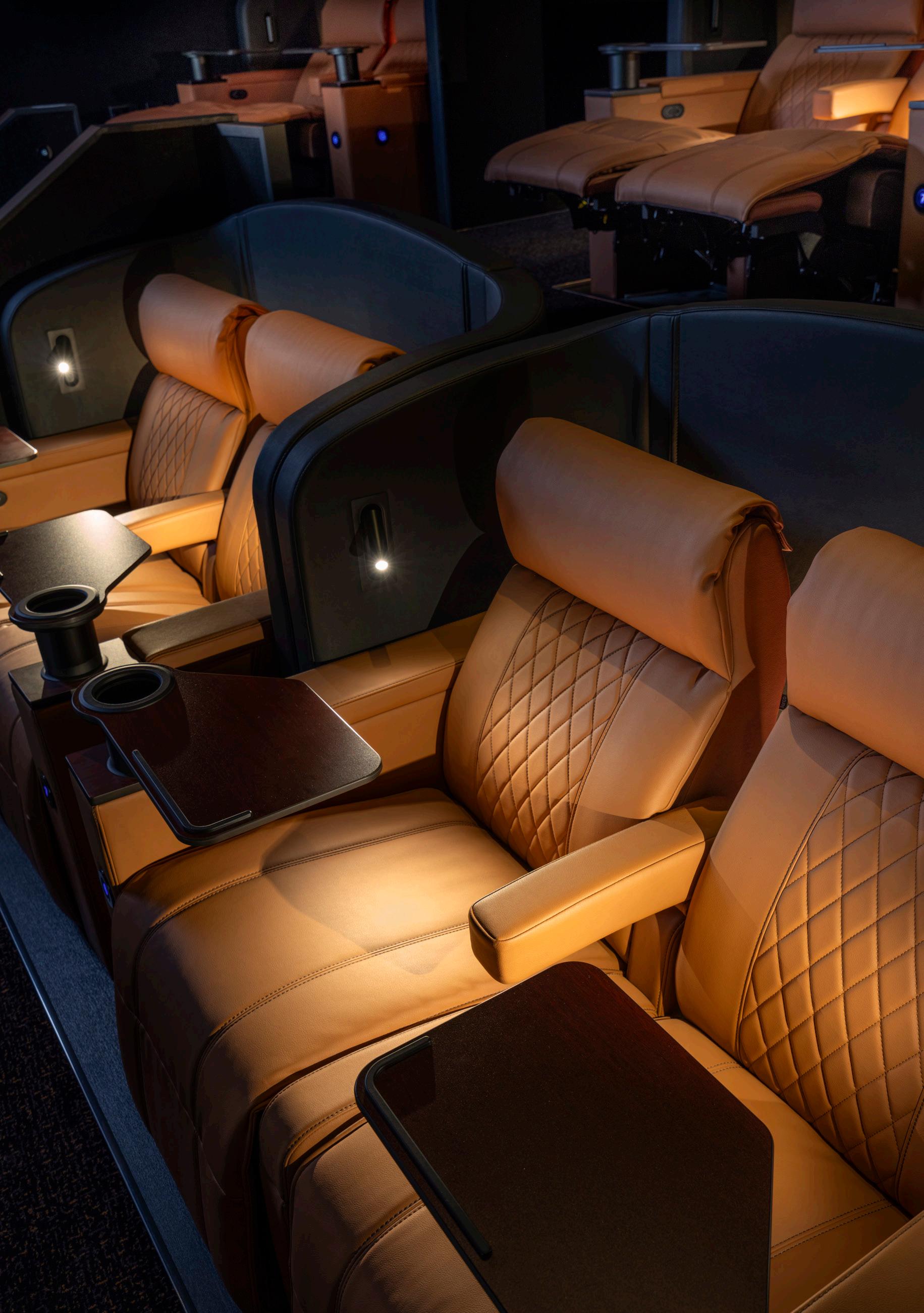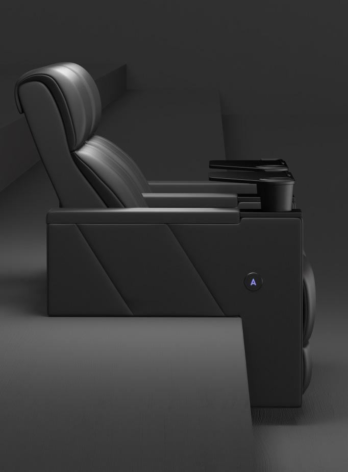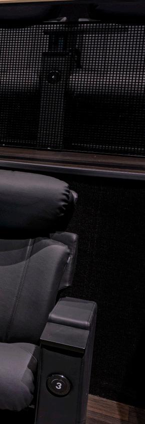 At the foot of the auditorium, the frontrow daybeds stretch out like invitations — generous platforms designed for those who want to sink deeper into the moment, lounging fully as the film unfolds above them. These daybeds set the opening note, while the Opus Glide seats carry the melody through every row, creating a harmony of comfort, practicality, and quiet luxury.