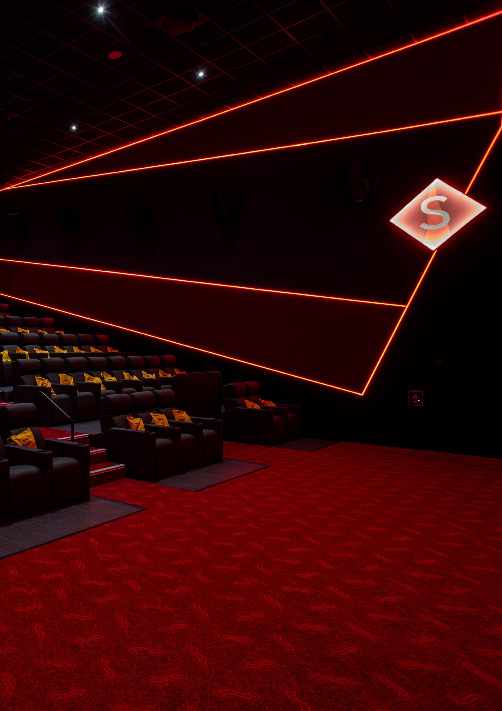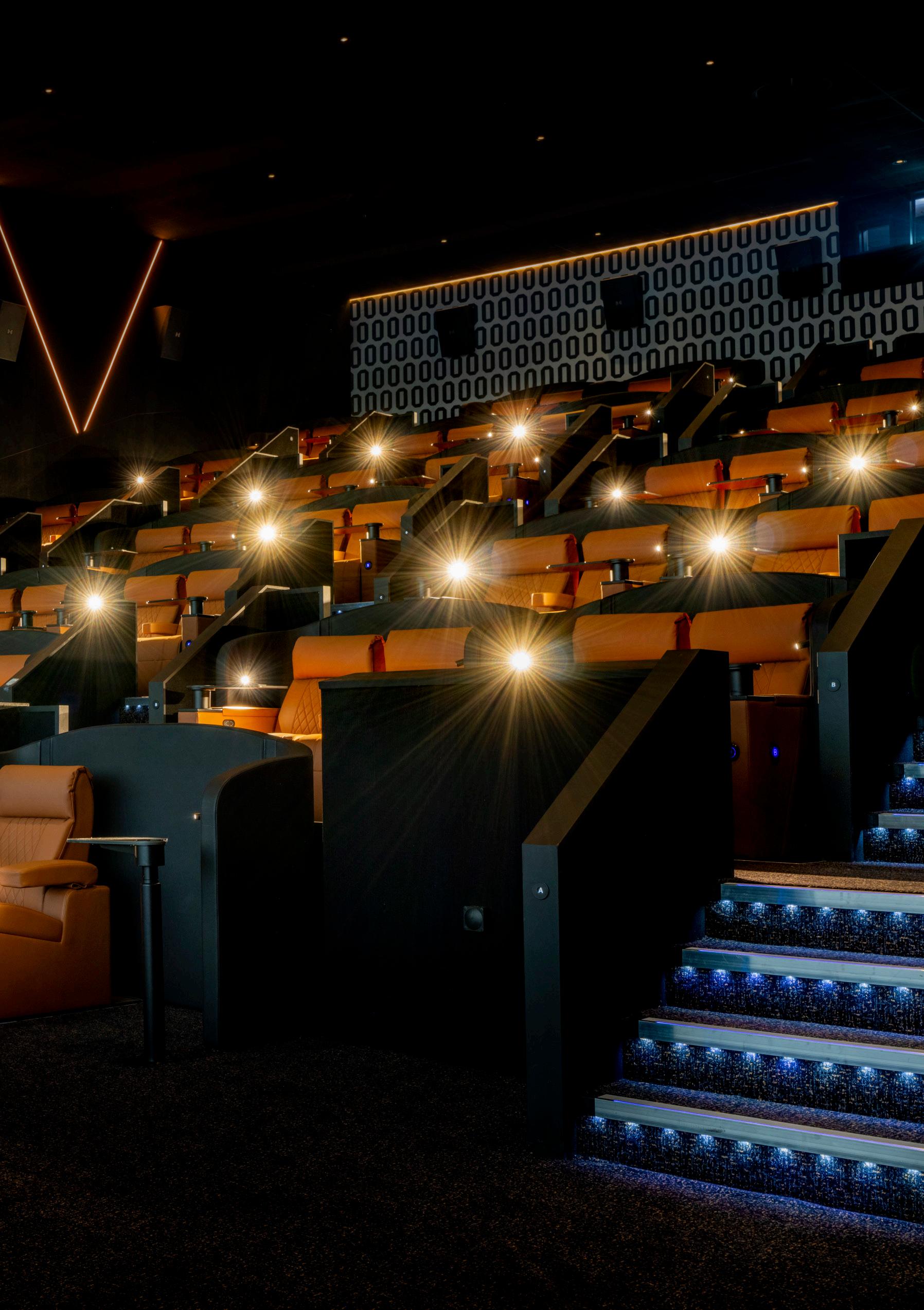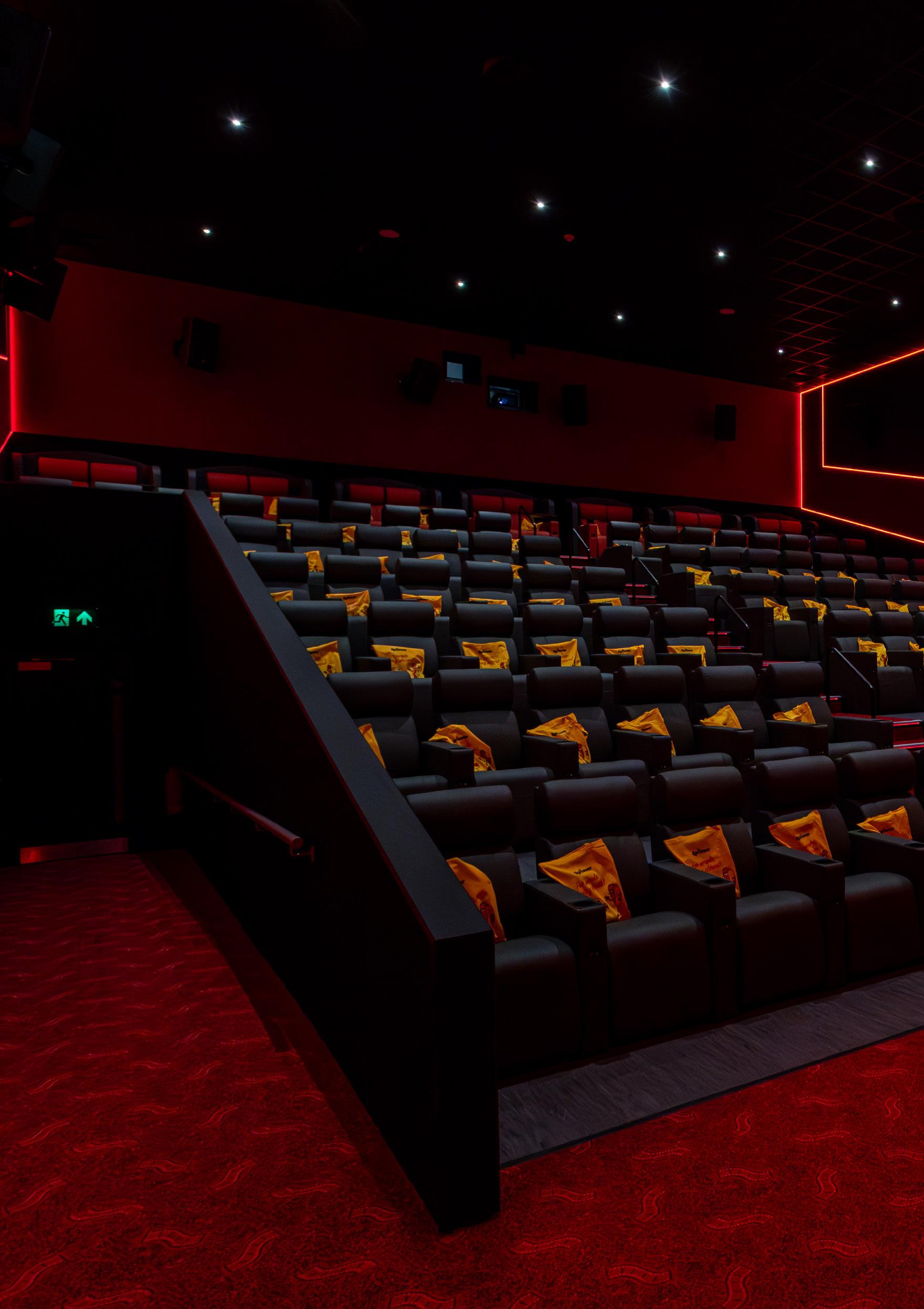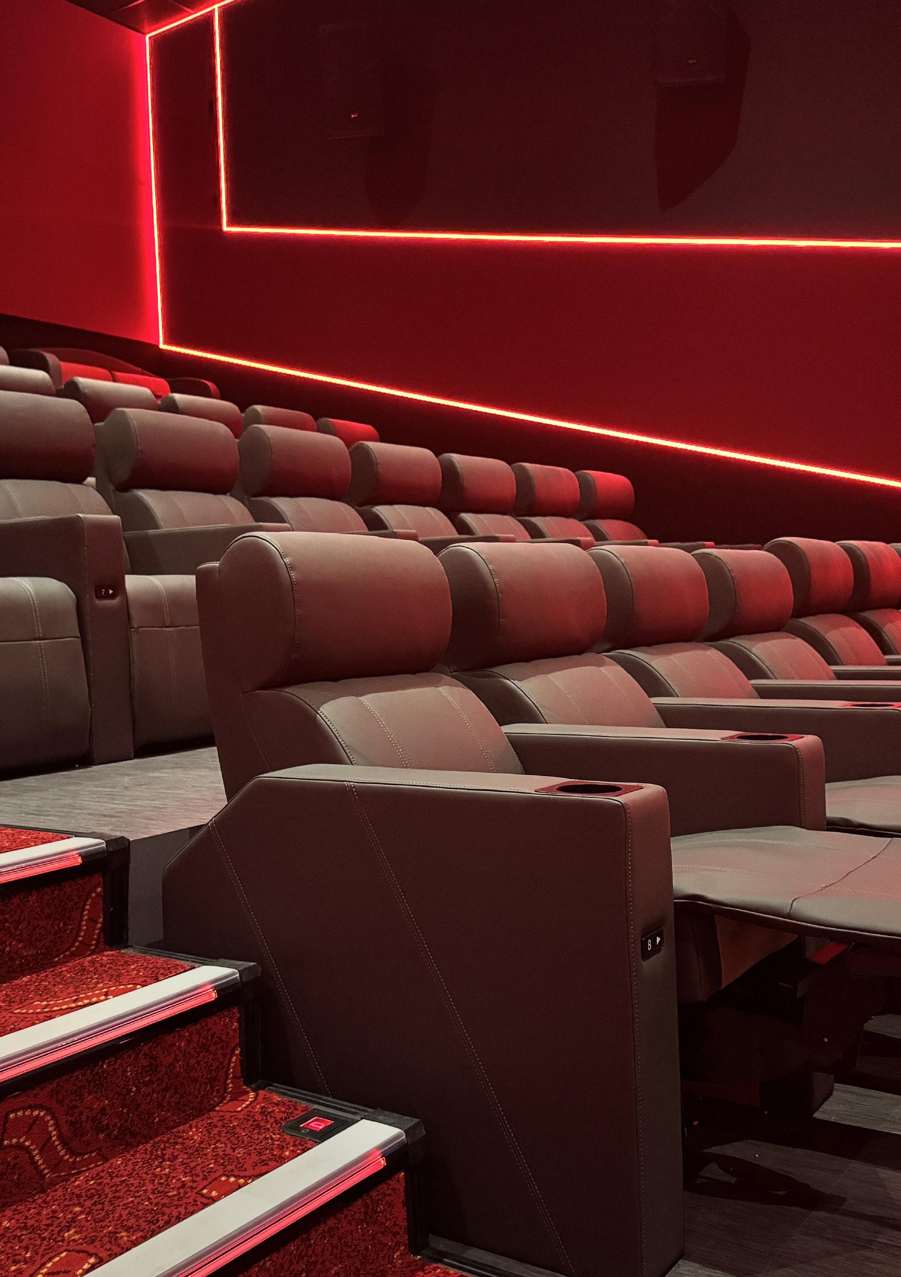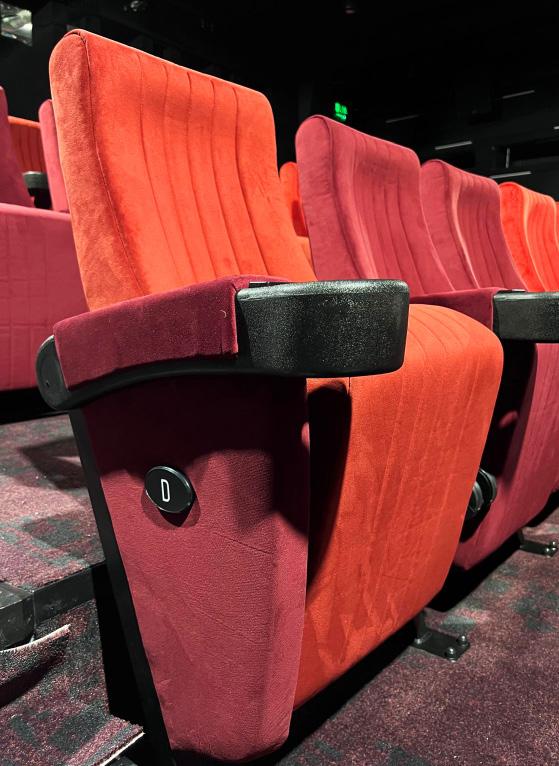 Each auditorium features its own identity through a curated colour palette, using plush, durable upholstery that adds warmth, luxury, and visual appeal. Flame-retardant and abrasion-resistant finishes were selected for long-term performance, while embroidered seat numbers and aisle markers subtly elevate the overall look and functionality. The deliberate reduction in capacity prioritises spaciousness, accessibility, and premium comfort reflecting a shift toward quality of experience rather than quantity of seats. The result is a cinema that feels intimate, thoughtfully designed, and purpose-built for modern audiences.