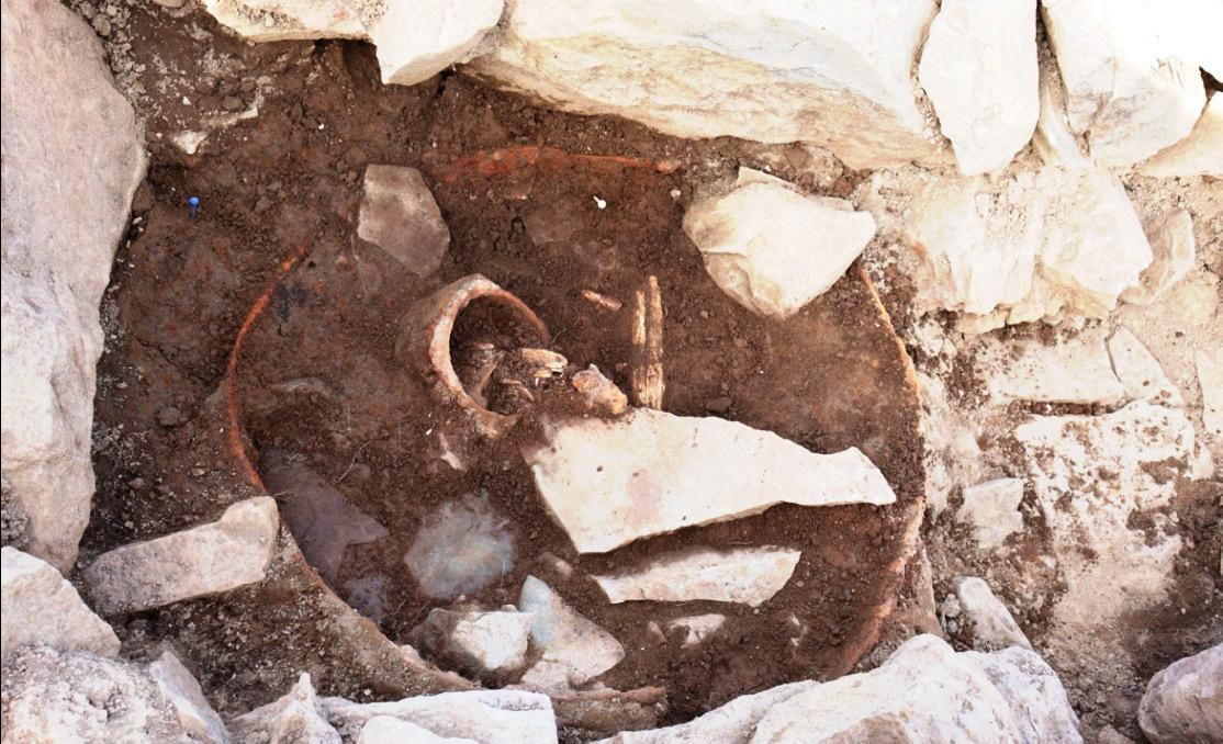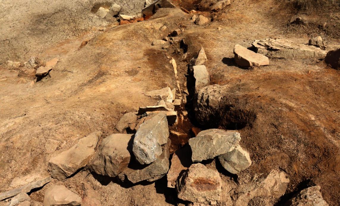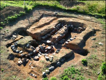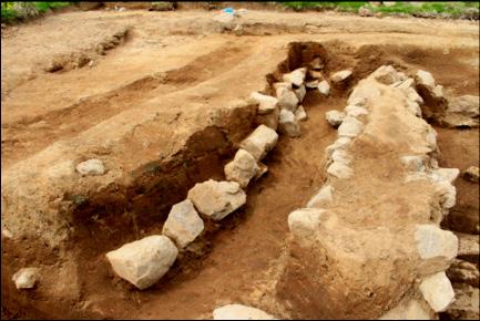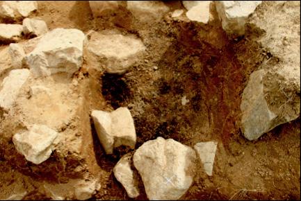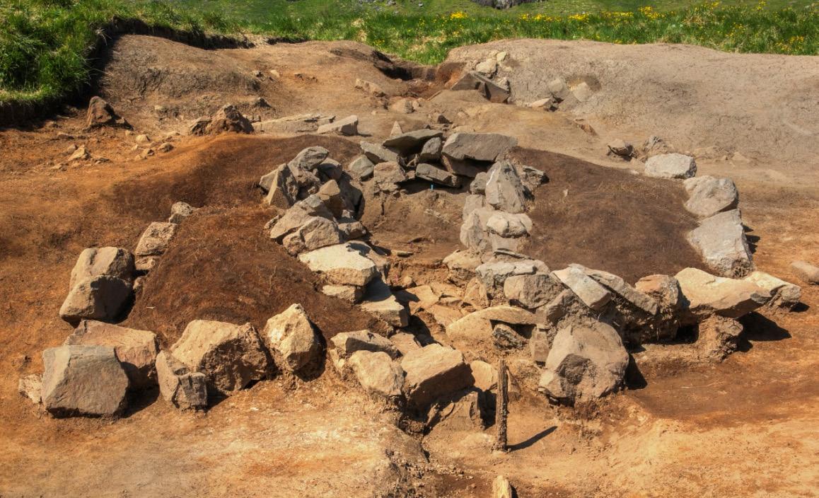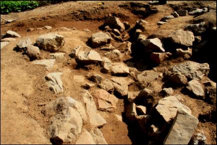 Structure [2048-28] was also fully excavated during the summer. It was a small house, built of turf and stones over a water mill used to grind grain. Water was taken from a stream above and directed by trenches through the mill. The mill wheel was horizontal, which is typical