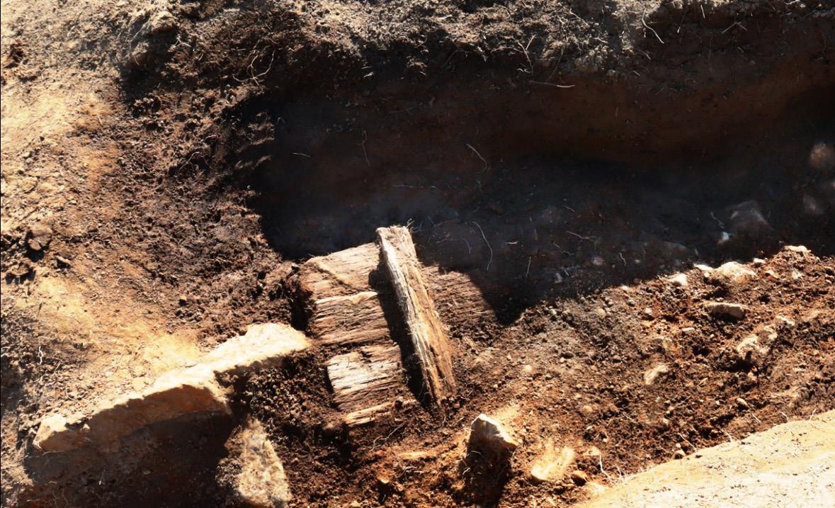 Viðarstokkurinn lá að mestu í lausu áfokslagi [8732] sem blandað var gjósku úr A-1875. Ofan við stokkinn var mikið steinakraðak og malarlag sem fjaraði út þar sem viðarstokkurinn byrjaði. Stokkurinn lá inn um op