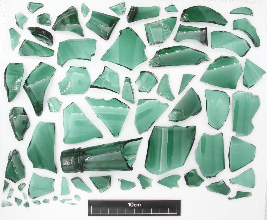 Flöskugler er undir ellefu fundarnúmerum, þar á meðal ein nánast heil glerflaska (F-1004) sem fannst í yfirborðslagi. Öll glerbrotin eru græn og fundust í fjórum mismunandi jarðlögum [6048], [7386], [8672] og [200].