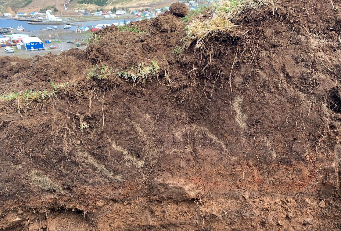 The test trench in structure [2048-11] revealed that the structure was built of turf. Its function is unknown but most likely it was used for animals or storage. The A-1875 tephra was detected in the turf, so the house must have been younger than that. The remains were sparse and most likely this building was one of those that were hit by the avalanche which fell on the village in 1885.