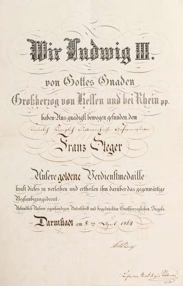 Fabónál olvashatunk arról, hogy az ifjú Stéger megtanult hegedülni és zongorázni, és egy Kulhánek nevű hegedűtanár képezte. 40 Az iskolai évek után Esztergomba utazott tizenhat évesen, hogy apja nyomdokaiba lépve gyógyszerészi pályáját megalapozza, és egy helyi patikában – az Arany Griffben – kezdte meg inaséveit 1840-ben. Miután három évig a gyógyszeres pirulák és kenőcsök készítésének szentelte napjait, kézhez kapta a gyakornoki éveket igazoló tirocinium oklevelét (7. kép) 1843-ban Újvidékre utazott, de már ekkor az motiválta elsősorban, hogy megfelelő zenetanárt keressen magának. Péterváradon41 sem találta meg számításait, ezért 1843 decemberében42 Belovárra tette át a székhelyét. Nem kizárt, hogy családi kapcsolatai révén került Péterváradra, tekintettel orvosdoktor nagyapja péterváradi származására.