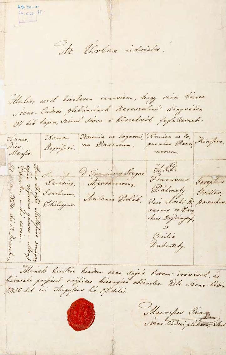 6. Stéger Ferenc keresztlevele, 1850 papír, viaszpecsét, kézírás 39 × 34,5 cm FMC TD 74.600.85