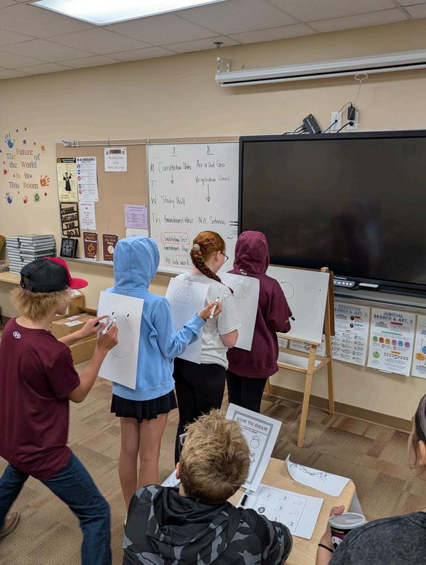 Students in 7th grade participated in a "Draw on the Back Challenge" in Mrs. Stich’s advisory class. They broke themselves into small groups, were given a picture and had to transfer that image to the white board through their small group. This was meant to be a fun and engaging activity that students of all drawing levels could participate in. The students had fun and were surprised by how difficult the activity was!