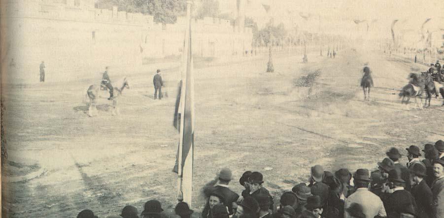 1 Vista de la Exposición y Feria de la Sociedad Rural Argentina. Grabado de la época en el que el artista Somerville refleja las instalaciones del recinto y la decoración con banderas argentinas y de otros países.