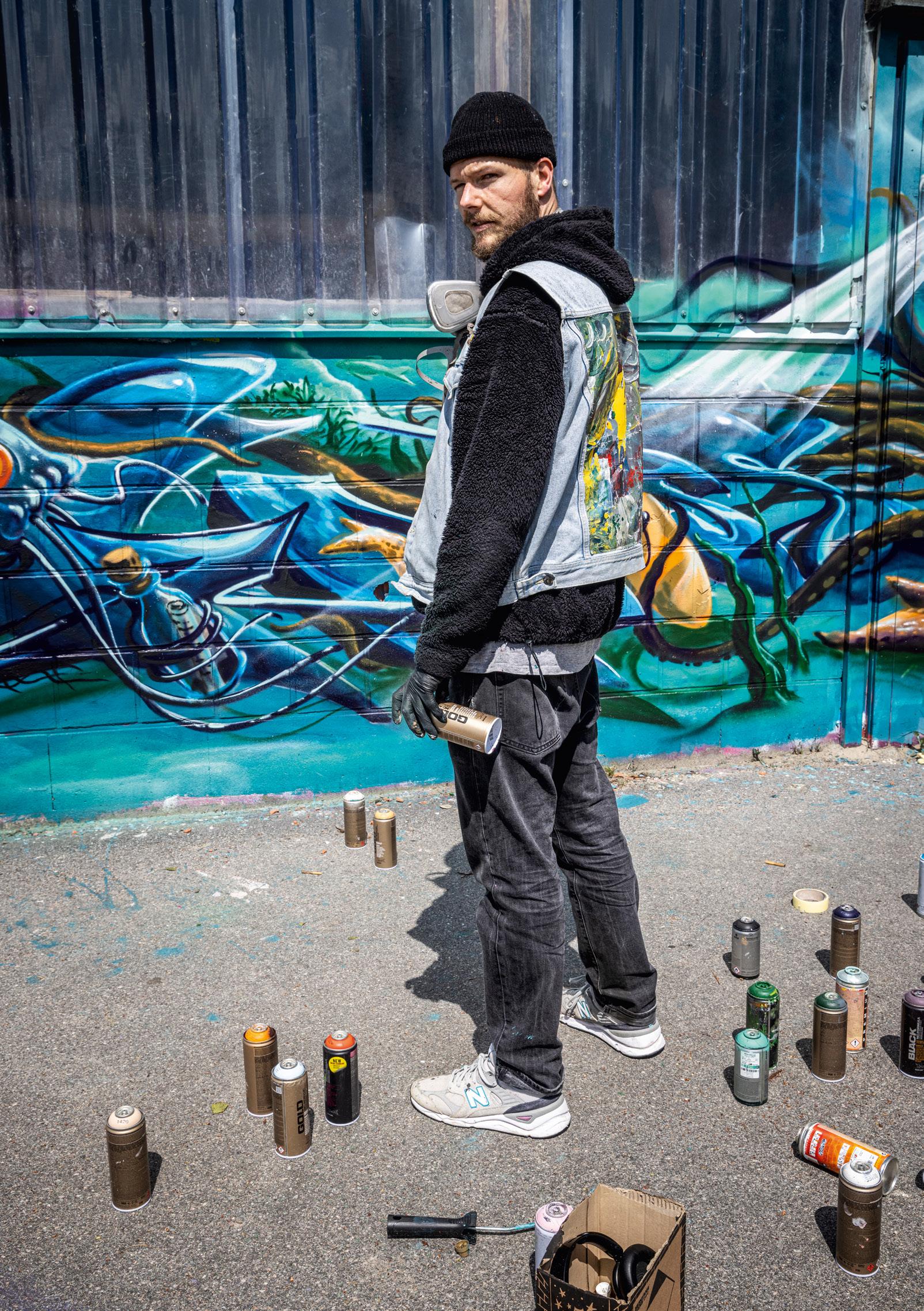 Damit wir den Sprayer bei seiner Arbeit erleben können, hat das Team vom Baumarkt Garrels spontan eine Wand rechts vom Eingang freigeräumt - und für ein neues Kunstwerk zur Verfügung gestellt. Tim lässt sich von der Umgebung - vis-a-vis vom Gasflaschenlager - inspirieren und entscheidet sich für ein Motiv mit Baumarkt Bezügen und einem Figurencharakter aus dem gesellschaftskritischen "Feel Good Inc." Kontext der Band Gorillaz. Wir staunen, als wir sehen, wie der Künstler mit seinen Spraydosen ohne jede Vorlage Schicht um Schicht mit großer Geschwindigkeit ein beeindruckendes dreidimensionales Werk auf die Wand zaubert. "Für mich war von Anfang an klar, dass ich nicht nur Buchstaben male, sondern immer auch etwas erzählen möchte - ein Bild mit einem Thema dahinter." Bereits mit 16 Jahren sprüht er sein