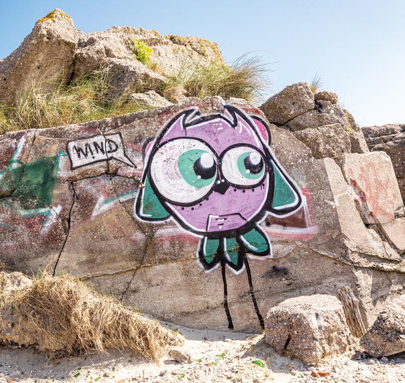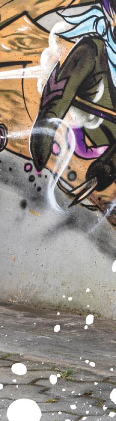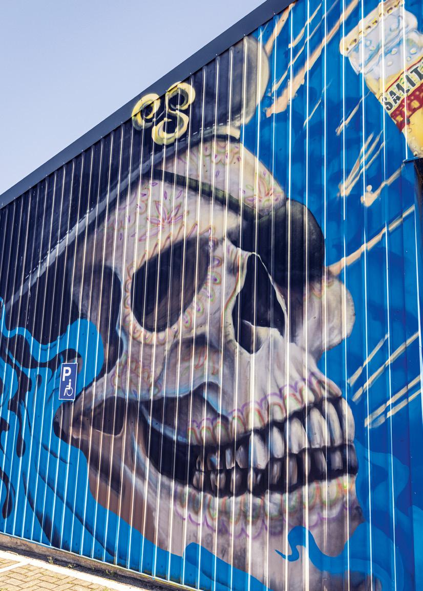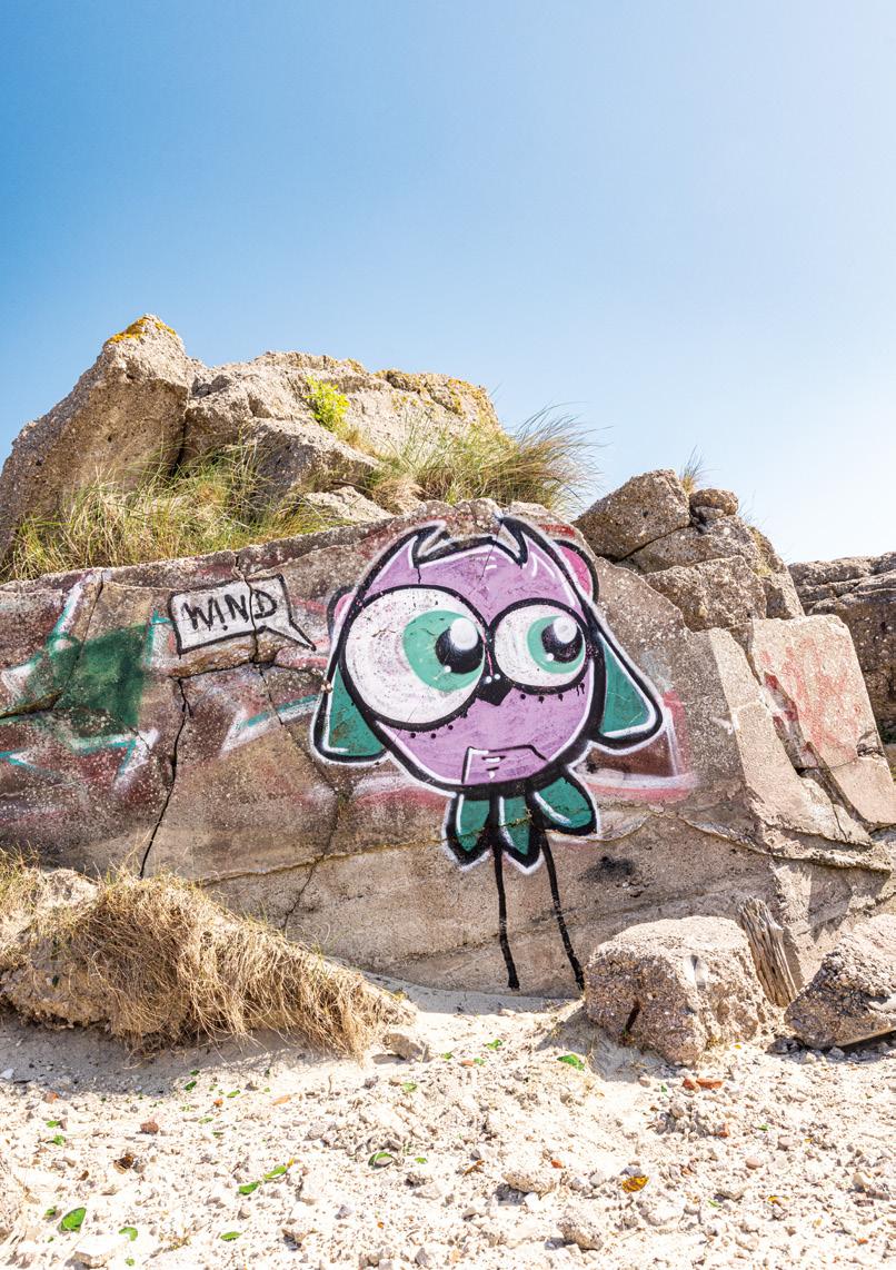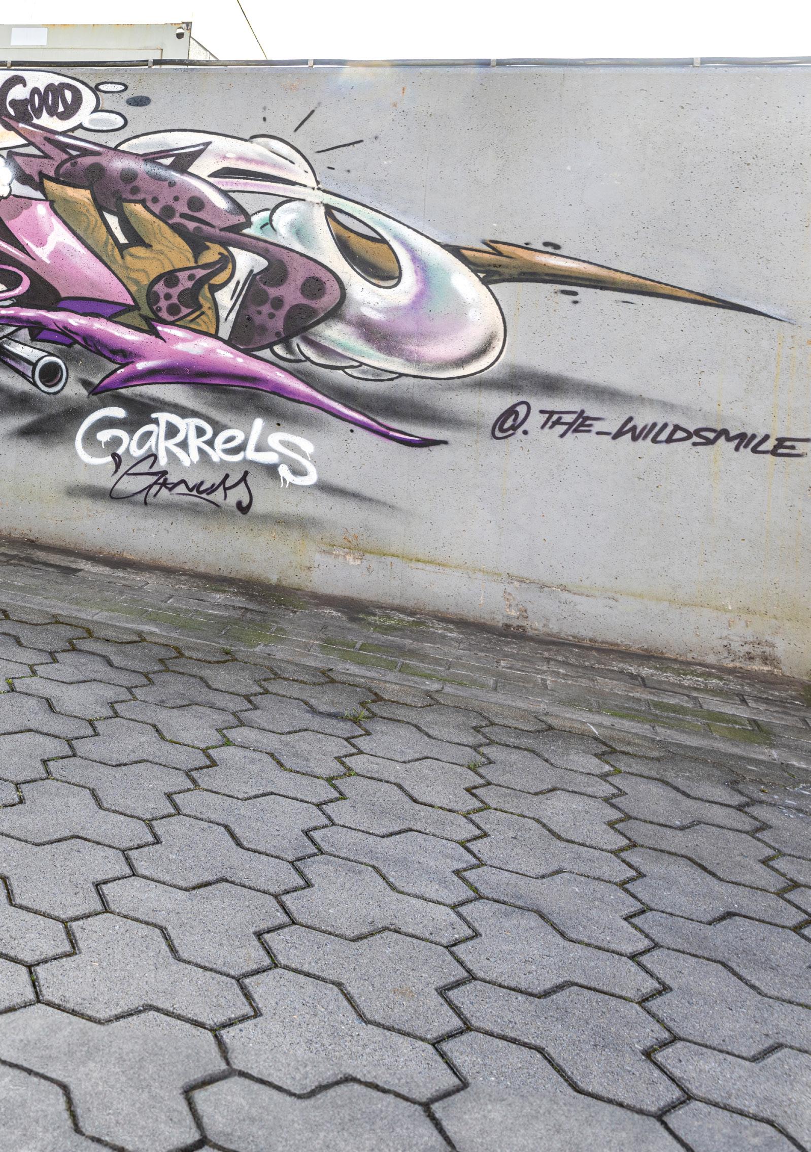 man eines der typischen "Freak" Motive des Streetart Künstlers Rebelzer. Besonders großflächig entfaltet die Fassadengestaltung im Hol'ab! Getränkemarkt schon von weitem ihre Wirkung. "Viva la Neyvolución". Die interessanteste Streetart Umgebung befindet sich aktuell rund um den Skatepark am Schwanenteich. Vor allem die Rückwand der Kinderspielhalle Kap Hoorn bietet mit einer "Hall of Fame" reichlich kreativen Raum. Schon in unserer Ausgabe #35 haben wir die Graffiti Wand im Jugendcafé an der Mühle bestaunt. Der in Ostfriesland bekannte Graffiti Künstler Tim Write gibt hier seit einigen Jahren Workshops für Norderneyer Kinder und Jugendliche. Wir haben zu Tim Kontakt über seinen Instagram Account ( @the_wildsmile ) aufgenommen - und er ist extra für diesen Beitrag auf die Insel gereist.