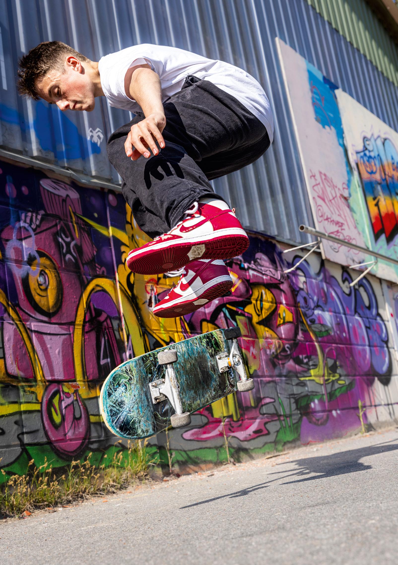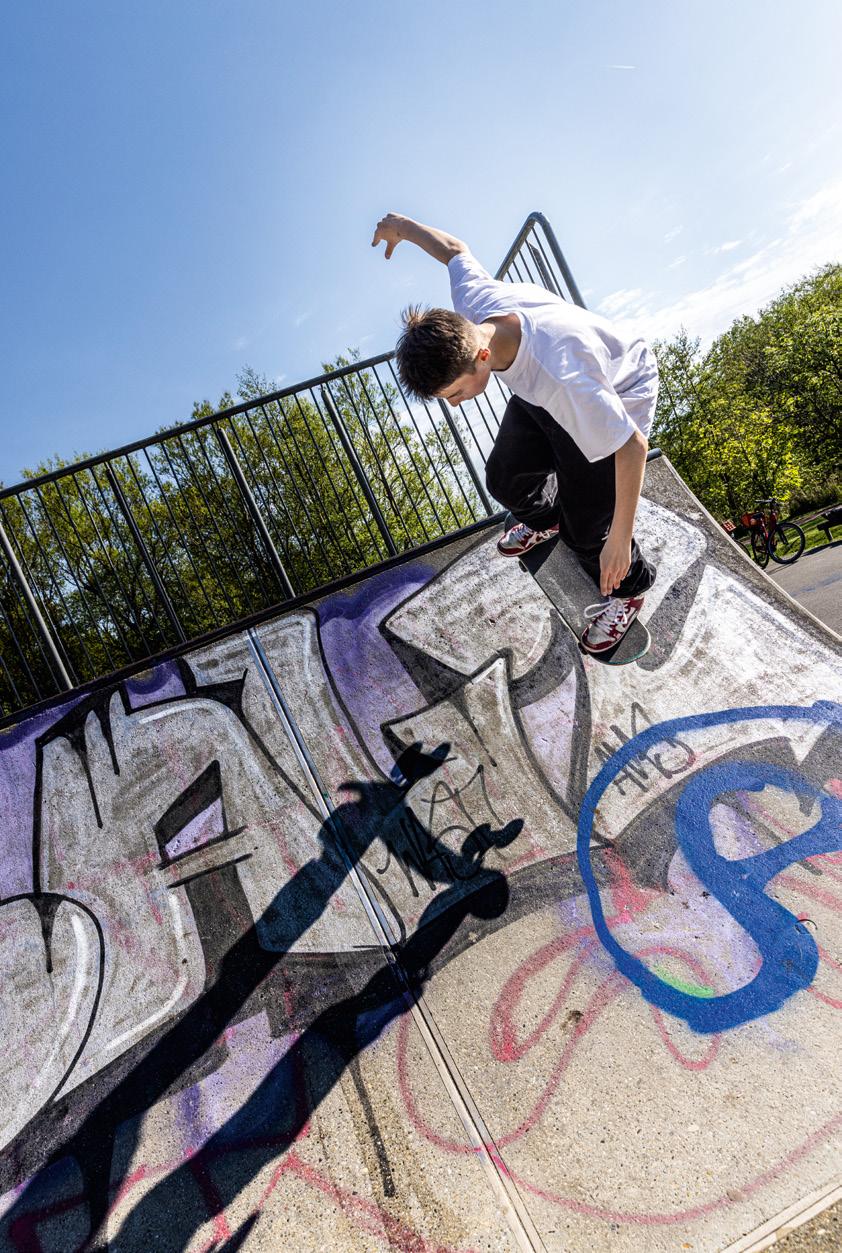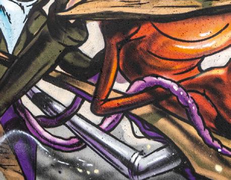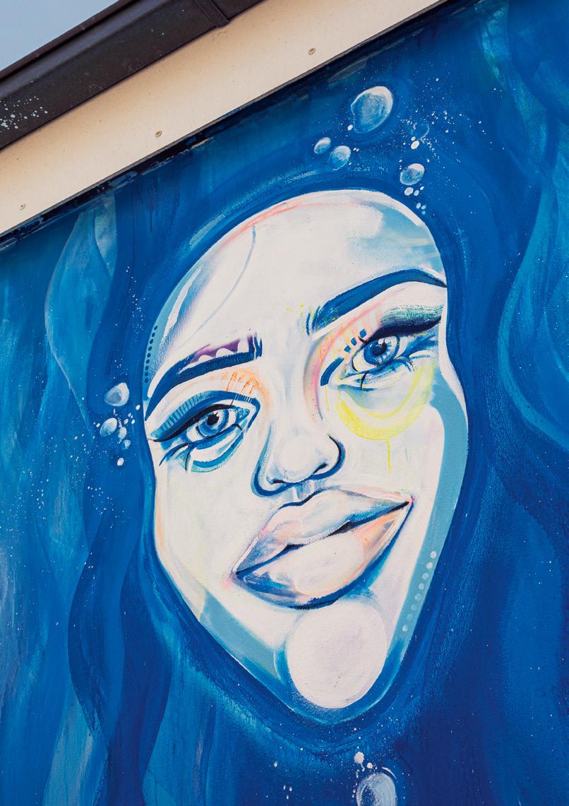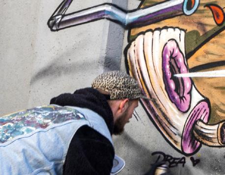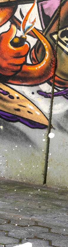man eines der typischen "Freak" Motive des Streetart Künstlers Rebelzer. Besonders großflächig entfaltet die Fassadengestaltung im Hol'ab! Getränkemarkt schon von weitem ihre Wirkung. "Viva la Neyvolución". Die interessanteste Streetart Umgebung befindet sich aktuell rund um den Skatepark am Schwanenteich. Vor allem die Rückwand der Kinderspielhalle Kap Hoorn bietet mit einer "Hall of Fame" reichlich kreativen Raum. Schon in unserer Ausgabe #35 haben wir die Graffiti Wand im Jugendcafé an der Mühle bestaunt. Der in Ostfriesland bekannte Graffiti Künstler Tim Write gibt hier seit einigen Jahren Workshops für Norderneyer Kinder und Jugendliche. Wir haben zu Tim Kontakt über seinen Instagram Account ( @the_wildsmile ) aufgenommen - und er ist extra für diesen Beitrag auf die Insel gereist.