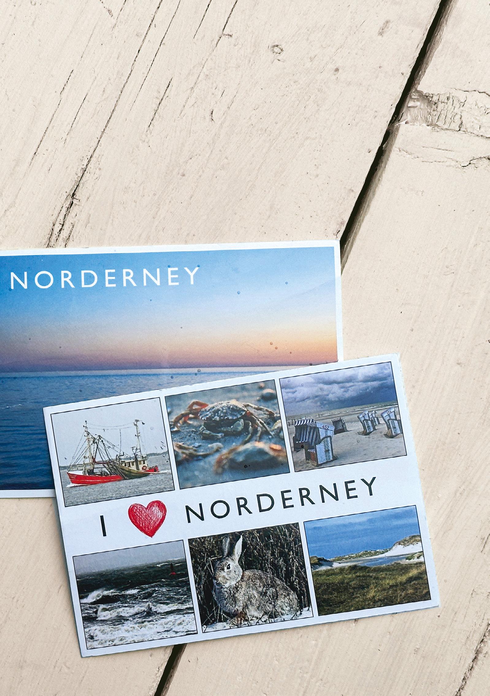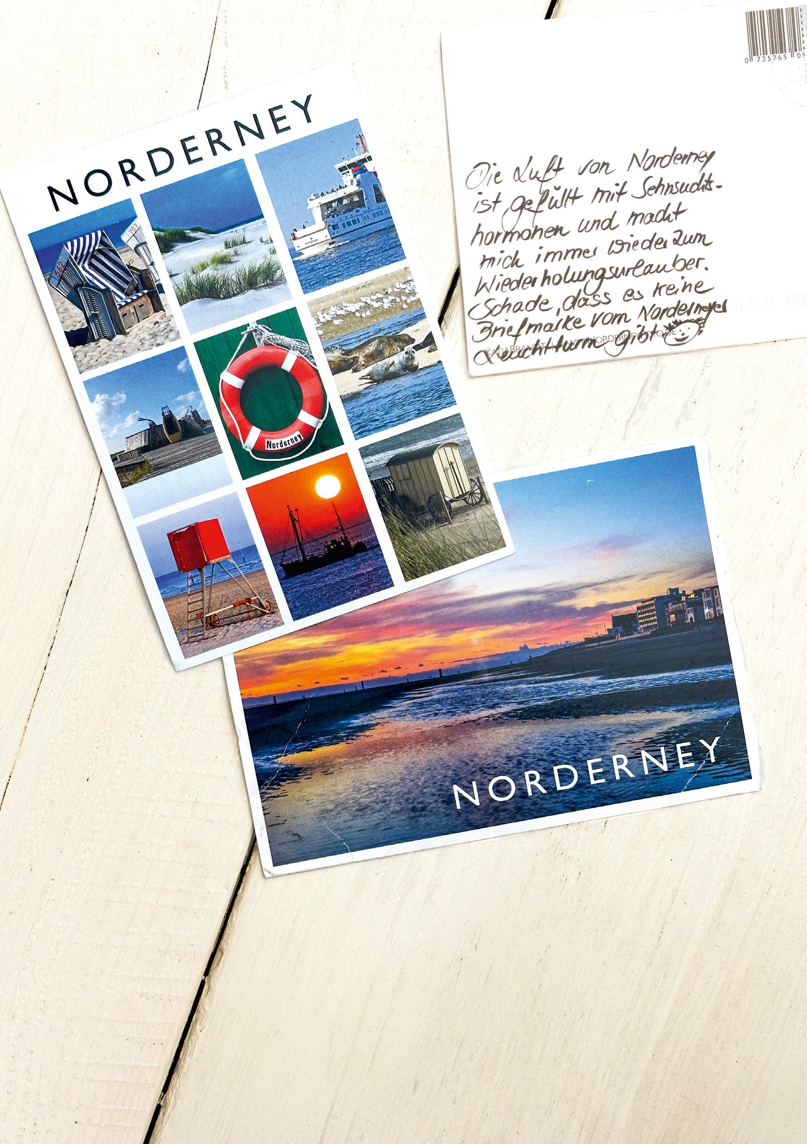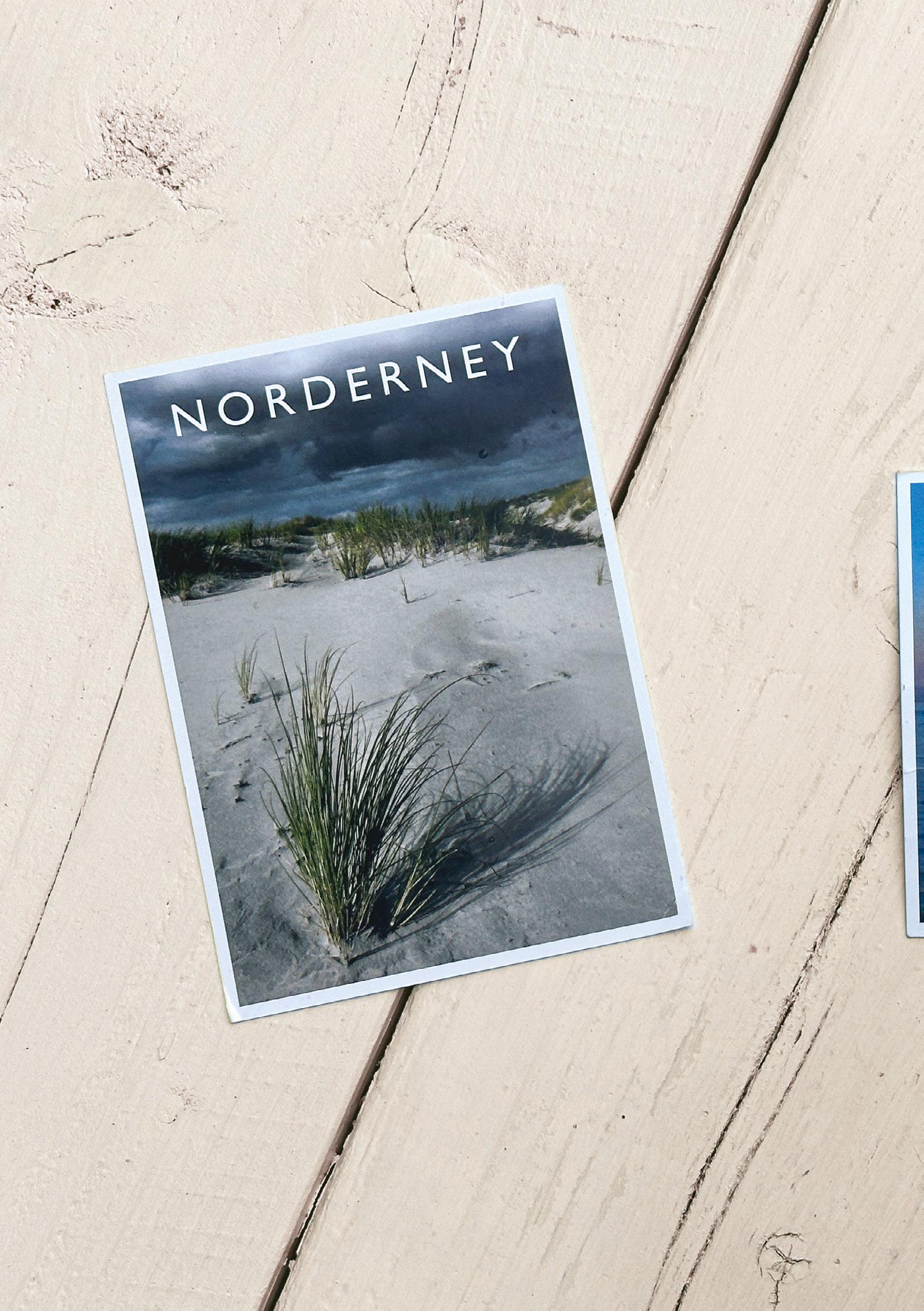 Wir haben in Ausgabe #32 - schon einmal Katja Brandt an dieser Stelle vorge- stellt. Die Norderneyer Fotografin (www.norderneyfoto.de) ist nicht nur im Netz aktiv. Sie produziert auch wunderschöne Postkarten, die zum Beispiel bei Thalia in der Poststraße oder bei Papierwaren Luttmann in der Friedrichstraße erhält- lich sind. Davon haben wir einen Stapel gekauft, frankiert und an uns selbst ad- ressiert - und mit der Bitte versehen, etwas Nettes über Norderney zu schreiben. Mit gedämpften Erwartungen haben wir die Postkarten anschließend kreuz und quer auf der Insel versteckt - vom Strandkorb bis zur Aussichtsdüne. Der Rücklauf hat uns überrascht. Fast zwei Drittel der Karten sind bei uns angekommen. Dar- auf finden sich lustige Sprüche, kleine Gedichte und Worte tiefer Zuneigung für Norderney. Es bleibt ein gutes Gefühl, eine Postkarte im Briefkasten zu finden. Aber dafür muss man sie schreiben.
