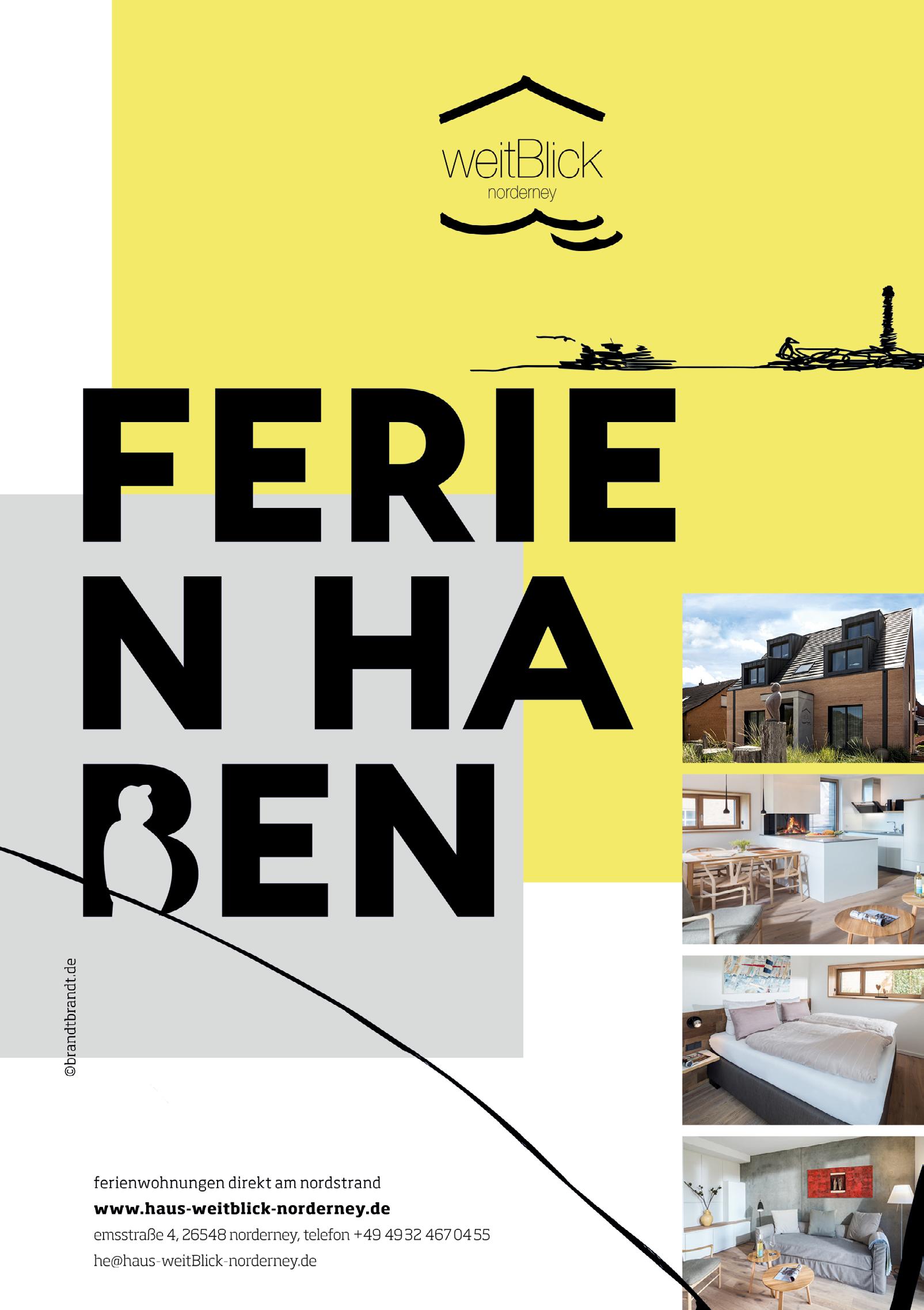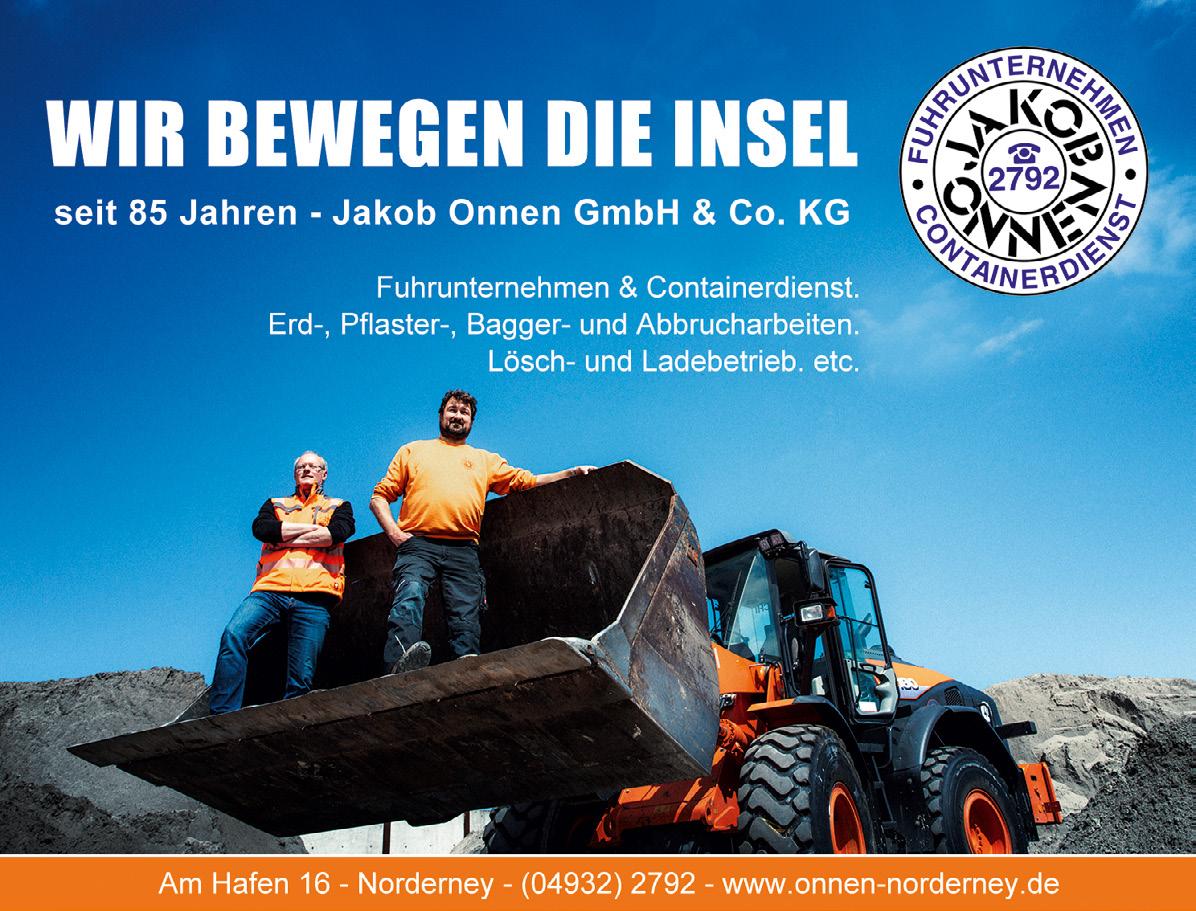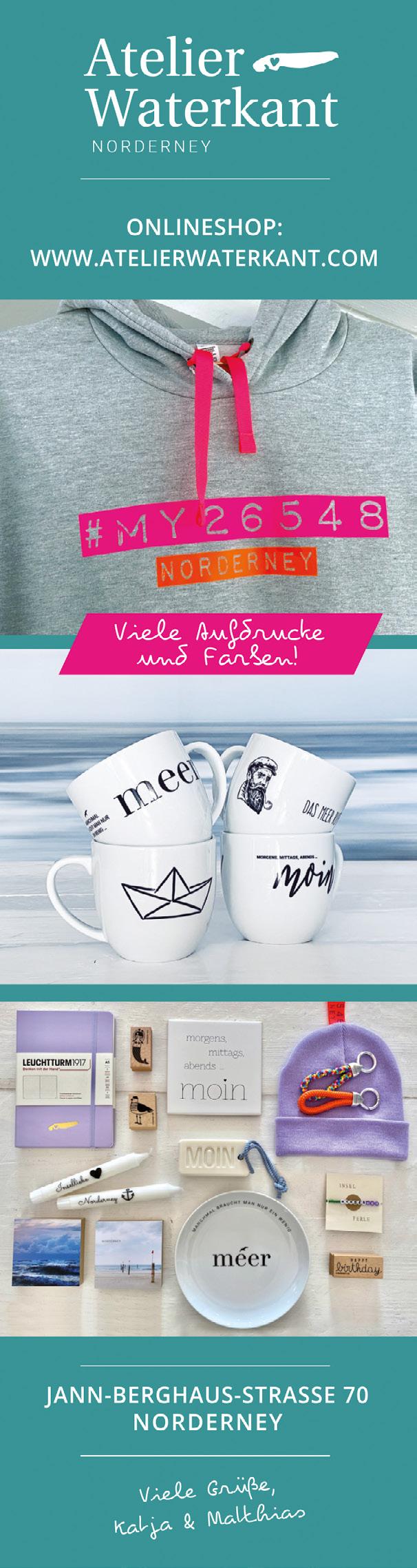 182 Ferienhaus Naase 187 Georgshöhe 191 Onkes-Fritsching 192 Medienmix 197 Faldern Immobilien 200 Besondere Bauten 202 Raumfabrik 204 Adressen FREIZEIT. 240 Summertime 245 Reiner Will 249 Wir:So! 250 MP mooi 252 Strandmusik 259 Julia Ristow 260 Musikfest 263 Watt Welten 264 Surfschule 266 Mario Dirks 269 Beauty Room 270 Bademuseum 272 Adressen OUTRO. 293 Kunsthalle Emden 294 Haldern Pop 298 Register 301 Inserenten 302 Kontur & Profil 305 Stadtplan 306 Impressum @ahoi_norderney spotify:user:ahoinorderney facebook.com/ferien.ahoi.norderney