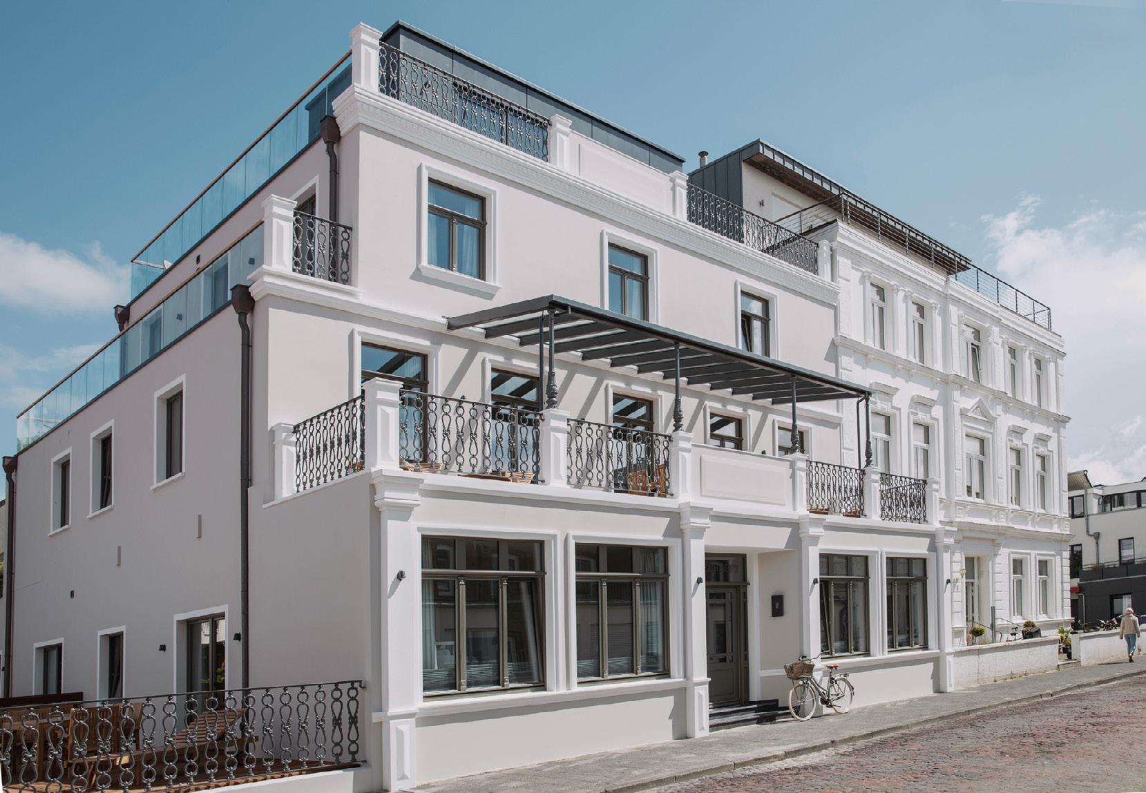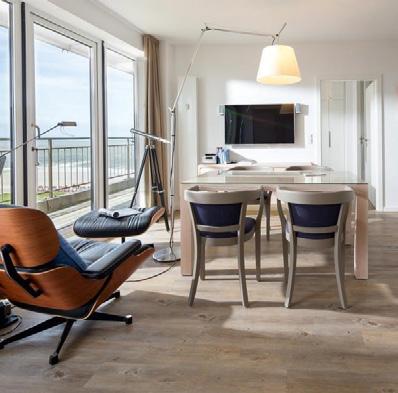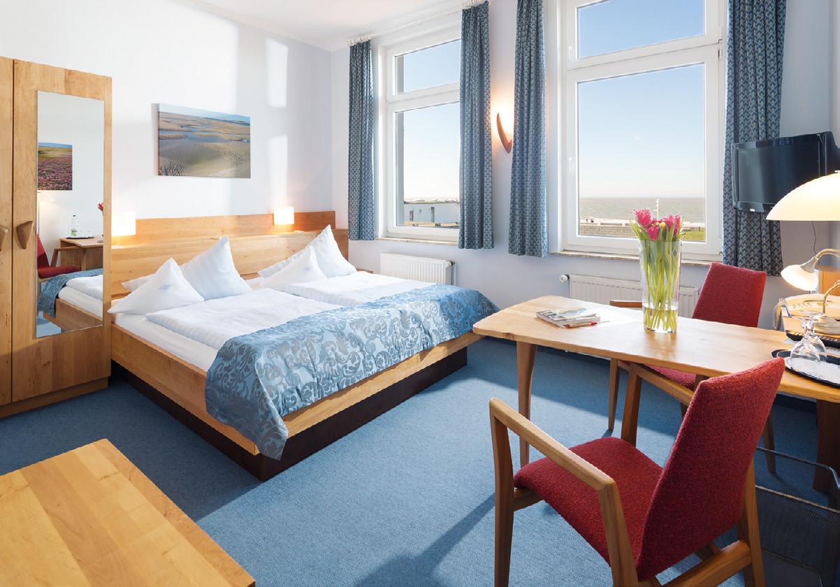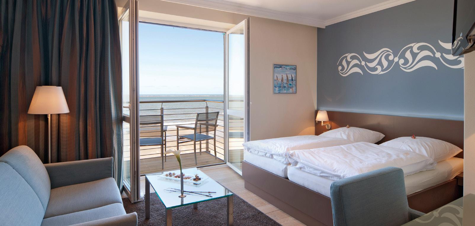 zum Meer. Speziell der Blick durch die Fenster im Erdgeschoss wirkt auf uns beinahe surreal. Kein zweites Hotel auf der Insel ist so dicht am Spülsaum gelegen wie das 1884 Norderney. Bei den zwischen 26 und 71 Quadratmeter großen Zimmern und Suiten fällt sofort auf, wie individuell unterschiedlich sie gestaltet sind - nicht nur im Detail, sondern grundätzlich. Immer gleich