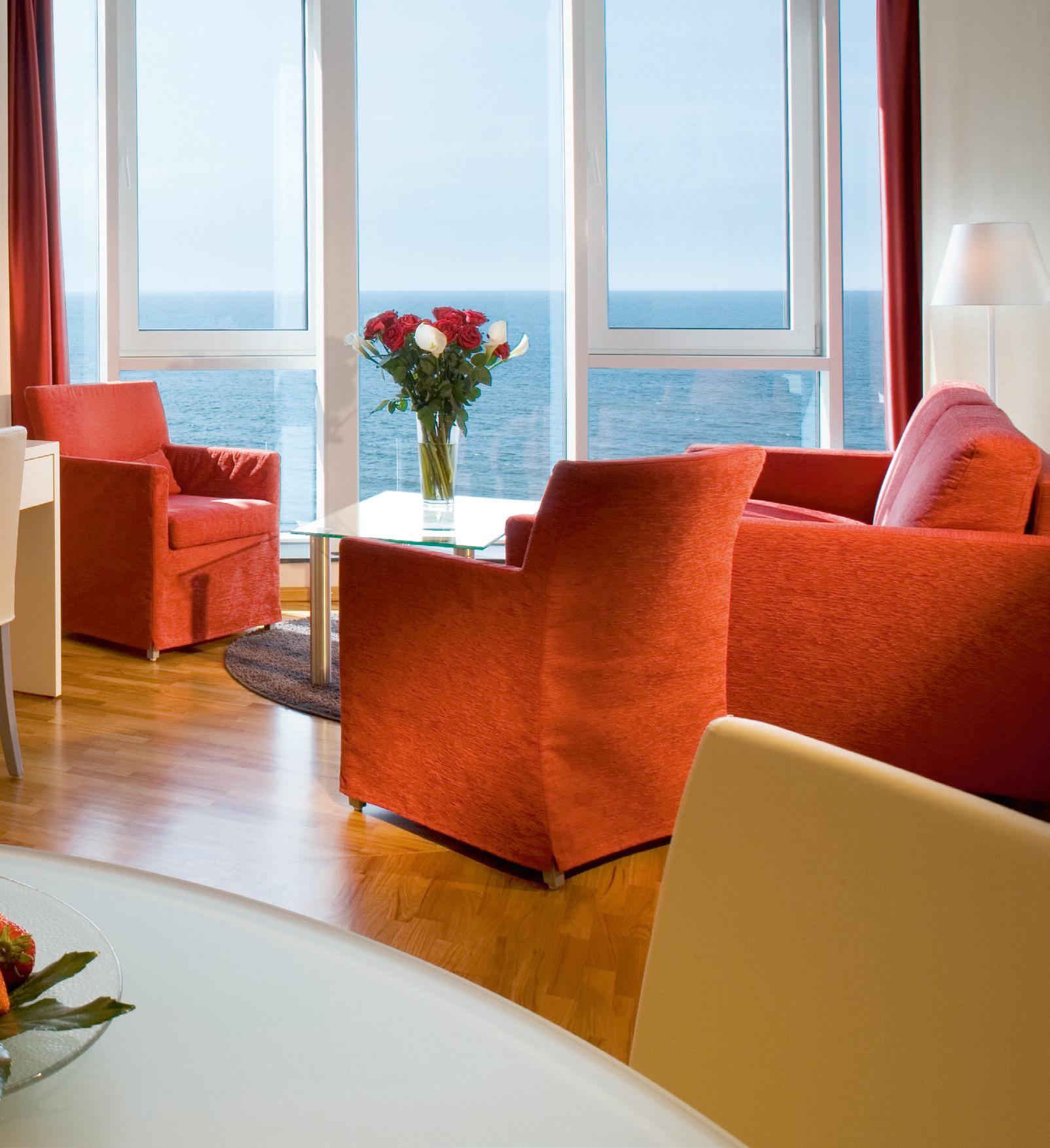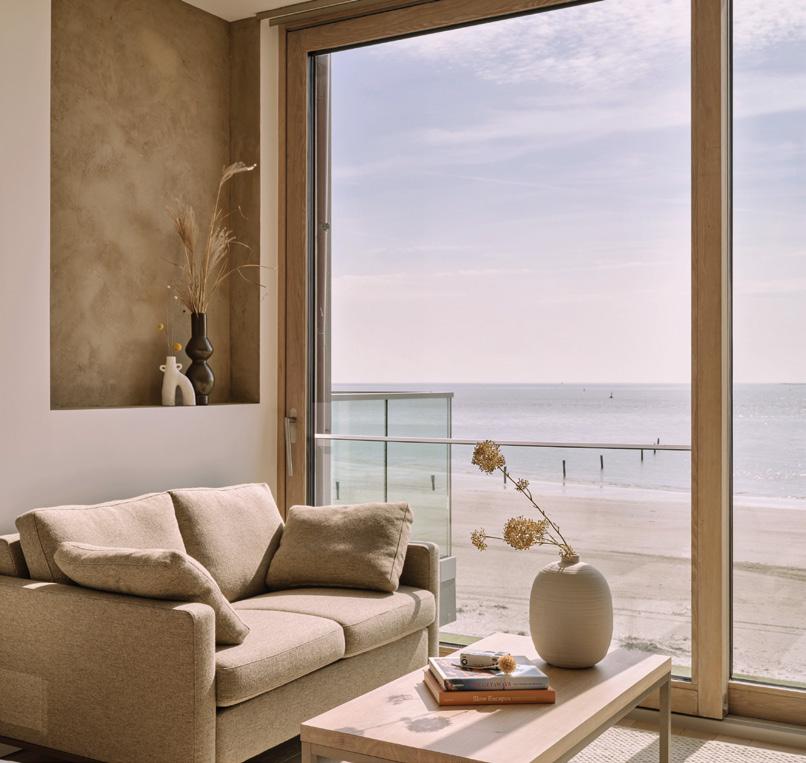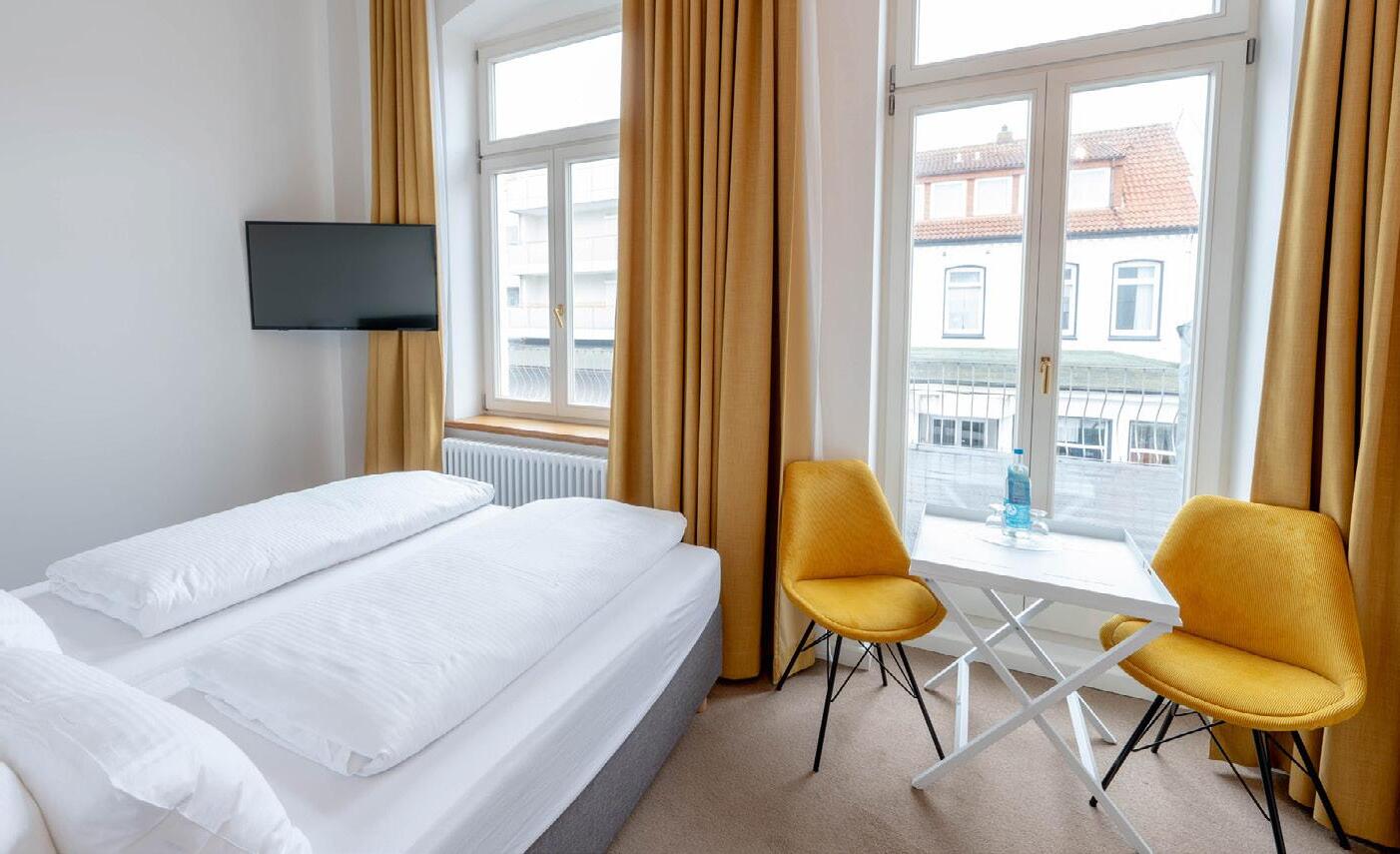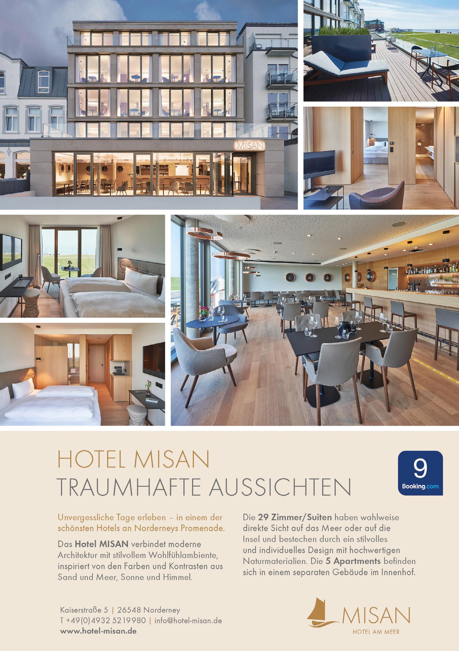zum Meer. Speziell der Blick durch die Fenster im Erdgeschoss wirkt auf uns beinahe surreal. Kein zweites Hotel auf der Insel ist so dicht am Spülsaum gelegen wie das 1884 Norderney. Bei den zwischen 26 und 71 Quadratmeter großen Zimmern und Suiten fällt sofort auf, wie individuell unterschiedlich sie gestaltet sind - nicht nur im Detail, sondern grundätzlich. Immer gleich