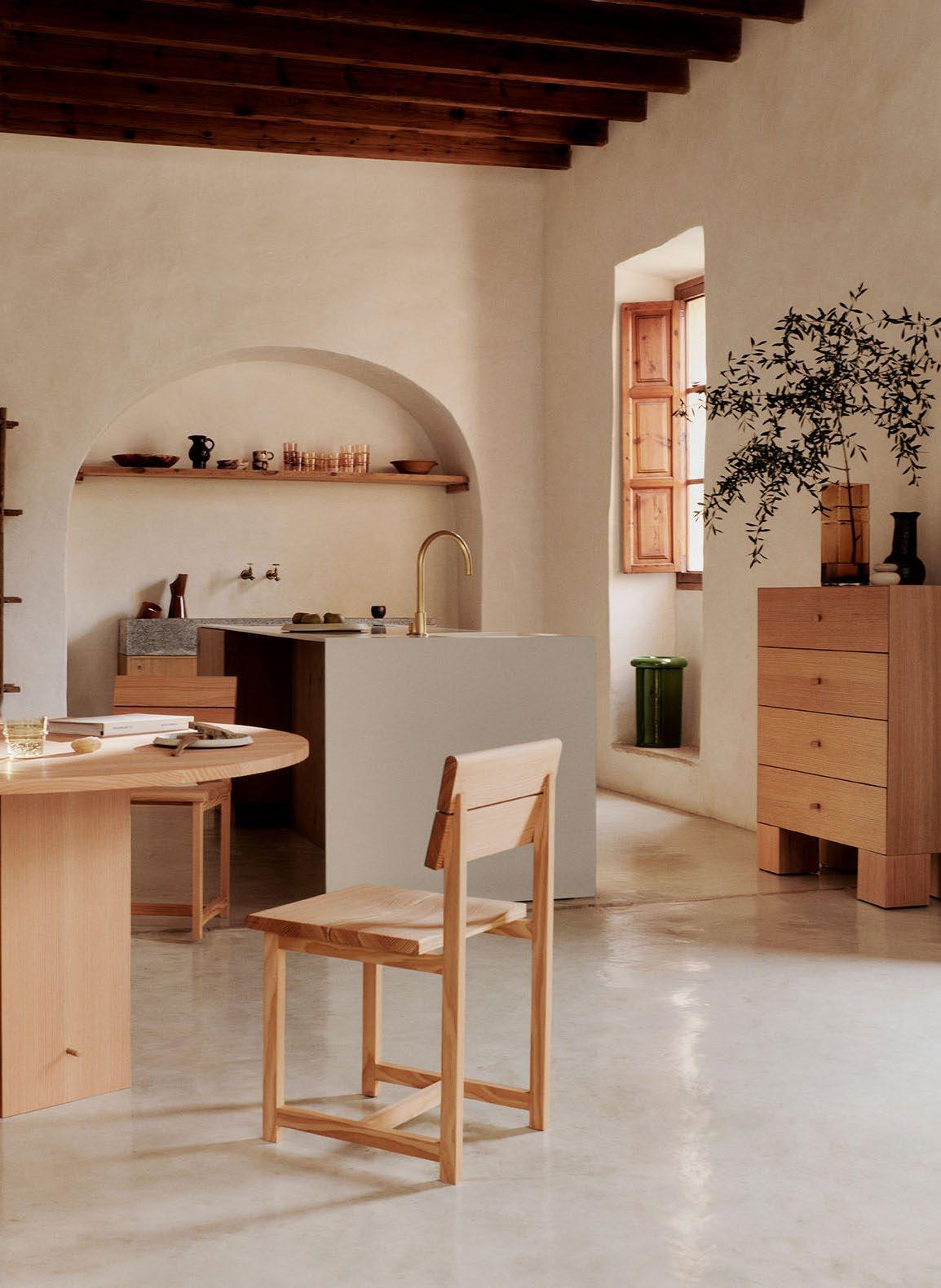 Inspired by the millwork featured in the home, the Vist Dining Chair and Aukko Dining Table are crafted from FSC™-certified Douglas fir, a material appreciated for its refined simplicity. These designs embody a light yet sturdy expression rooted in solid, unadorned honesty. Planks of wood and joinery come together to form designs that seamlessly integrate with the aesthetic narrative and ethos of Can Lis.