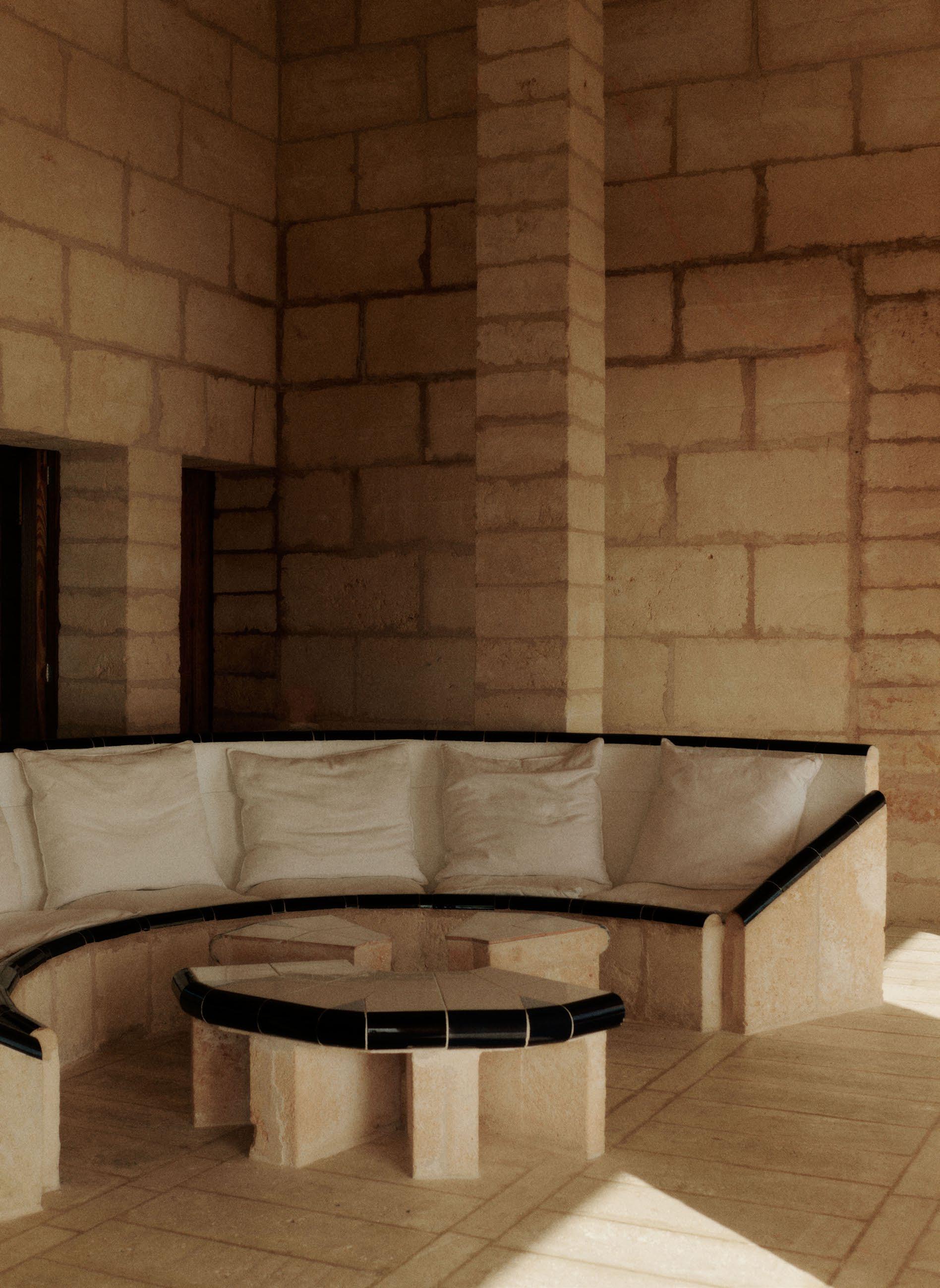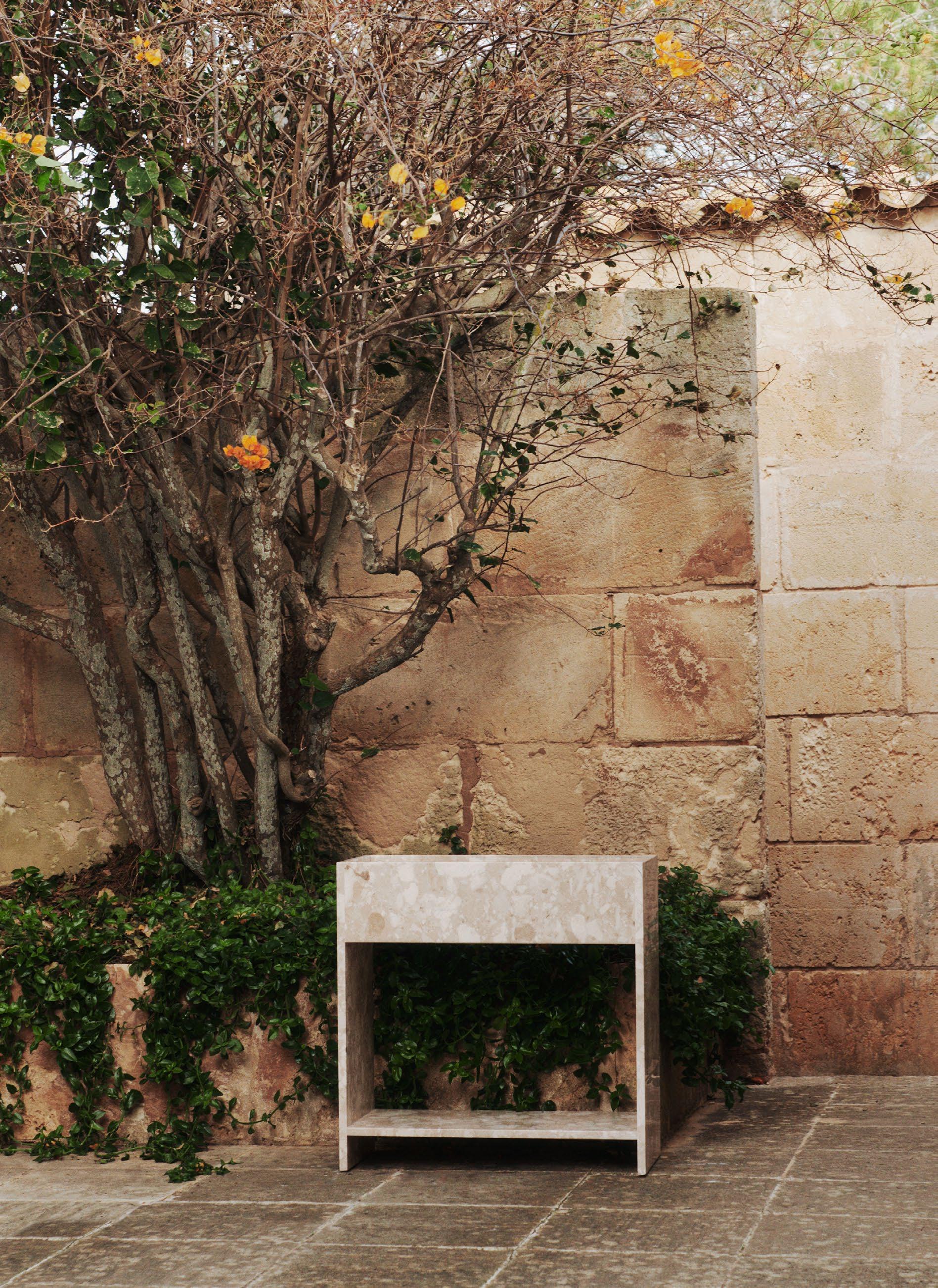 The ceramic tiles within Can Lis, sourced from local producers, challenge expectations of the space and provide a vibrant counterpoint to the sober, muted tones of the structure. They also serve as a canvas for some of Utzon’s most distinctive design details within the house, particularly his use of bullnose-edge tiles, characterised by their rounded edges that soften transitions and create a seamless, tactile connection between surfaces. This technique lends a friendly, soft form to the interventions, while the precise cutting of the tiles into geometric patterns adds layers of intrigue. Designed as a pair of outdoor tables, the Deya Side Table and Deya Coffee Table express a convergence of elements found throughout the site, reinterpreted into unified expressions.